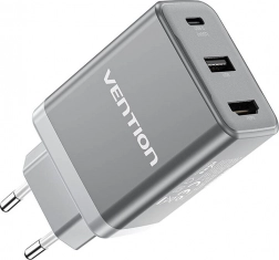 The compact Vention wall charger with GaN technology combines fast PD charging up to 65 W, USB‑C + USB‑A ports, and HDMI 4K@60 Hz. Charge up to three devices simultaneously, connect an external monitor, and enjoy universal compatibility with Windows, macOS, Android, and more—safely thanks to intelligent protection against overvoltage, overheating, and short circuit.