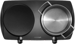 The compact CONCEPT VE3060 double hot plate cooker with a power of 2500 W delivers fast and even heating on both cooking zones. Thanks to smooth temperature control, it’s perfect for boiling, frying, and simmering. The ceramic plates are easy to clean, compatible with all common cookware types, and the appliance features a thermostat, overheat protection, and non-slip feet for safe use in small kitchens, cottages, or on the go.