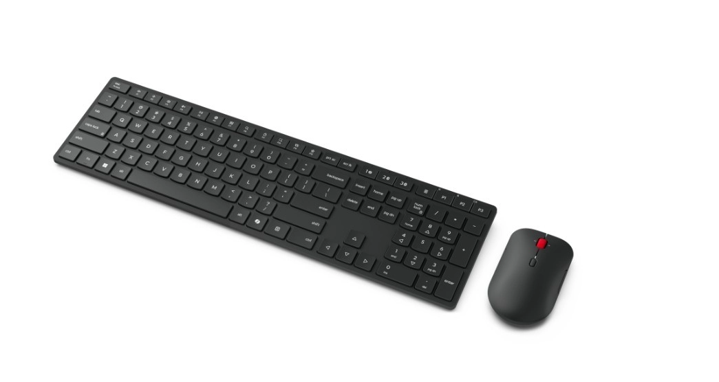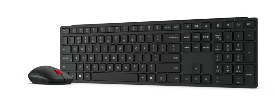 Low-profile keys and quiet switches reduce office noise. The ambidextrous mouse with silent click provides all-day ergonomic comfort.
