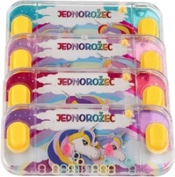 The game fits in a pocket, requires no batteries, and entertains at home or on the go. Each piece is supplied in one of the available unicorn designs.