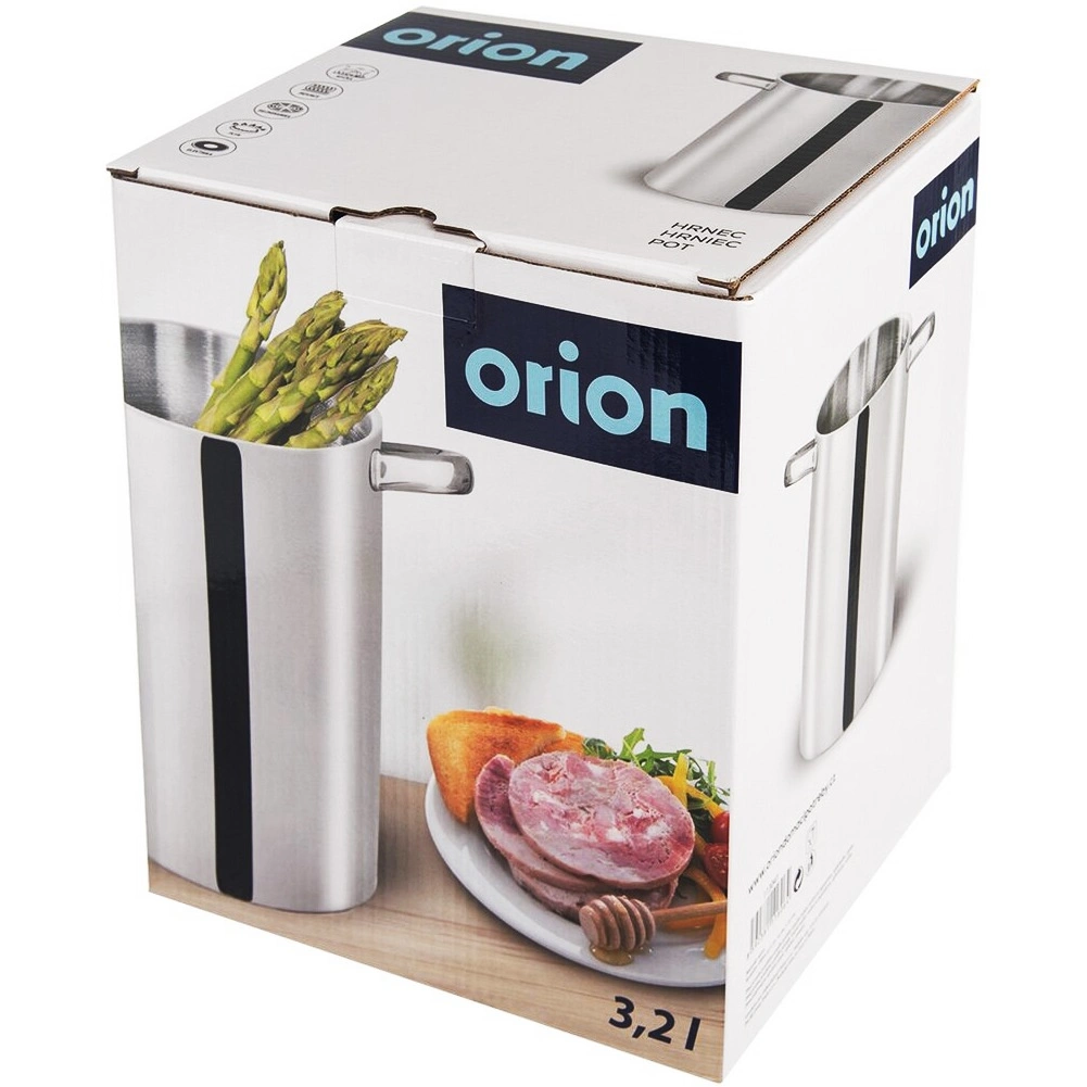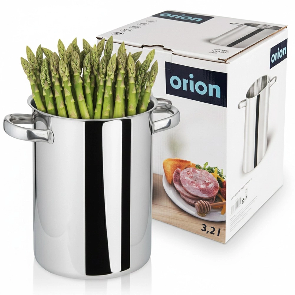 Tall stainless steel pot with a diameter of 14 cm and a capacity of 3.2 l, ideal for cooking asparagus, spaghetti, and other long ingredients. Thanks to the multi-layer acute-thermal base, it stores and distributes heat excellently, cooking efficiently with minimal water and fat. It features a polished exterior, a matte interior for easy maintenance, and sturdy riveted handles for safe handling. Suitable for gas, electric, glass-ceramic, halogen, and induction and dishwasher safe.