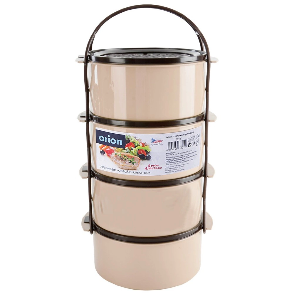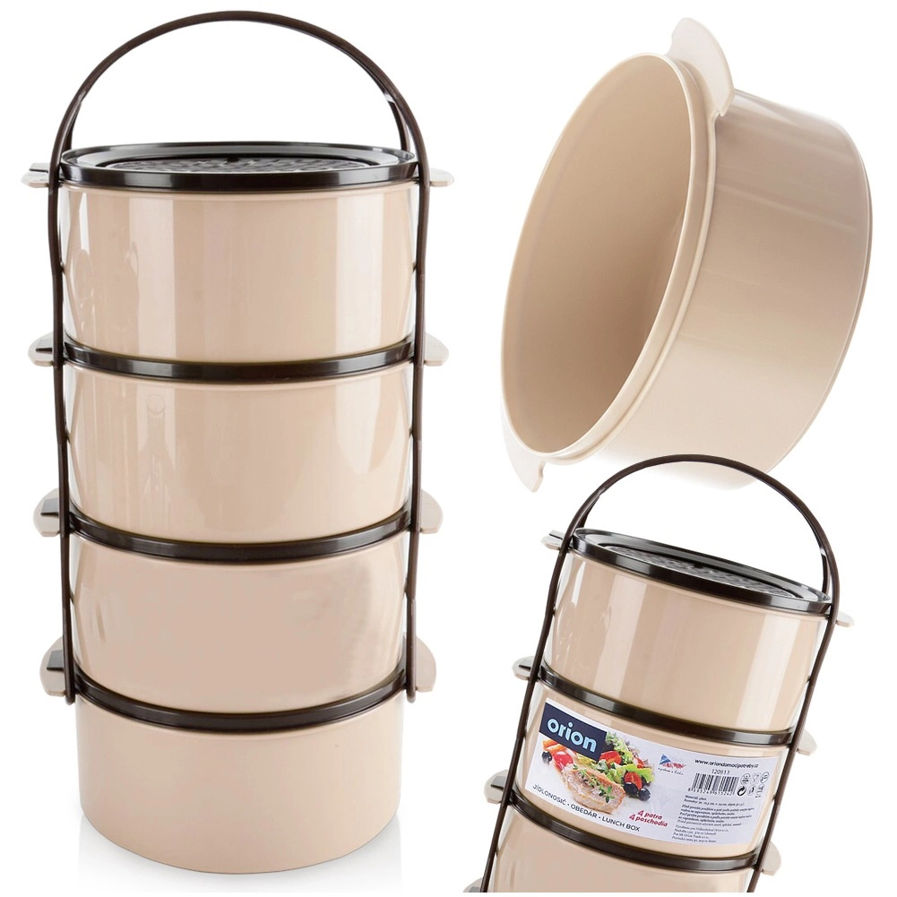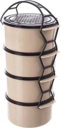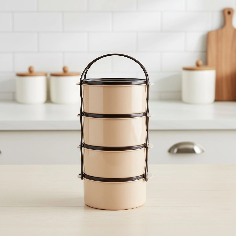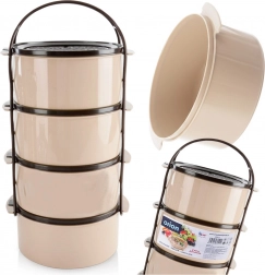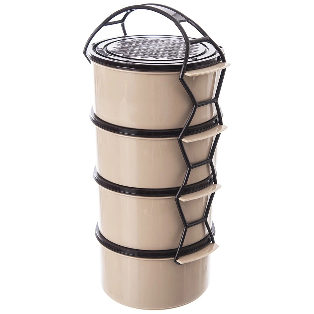 Practical four-tier food tiffin with a capacity of 4×1.5 l for clearly separated dishes. Features stackable containers with lids, a sturdy carrier frame with handle, and a durable beige–brown design. Suitable for the dishwasher, fridge, freezer, and for the microwave without lids.