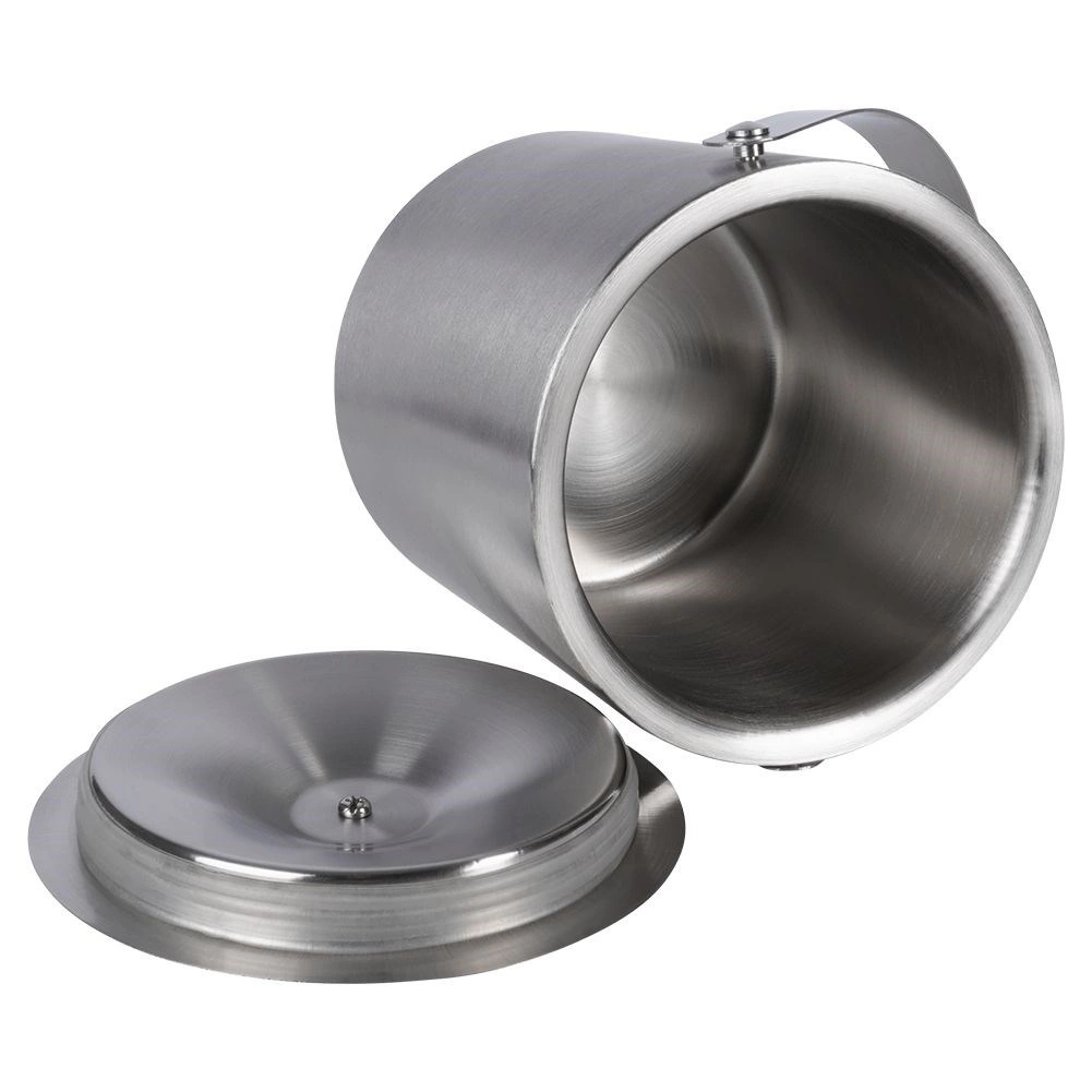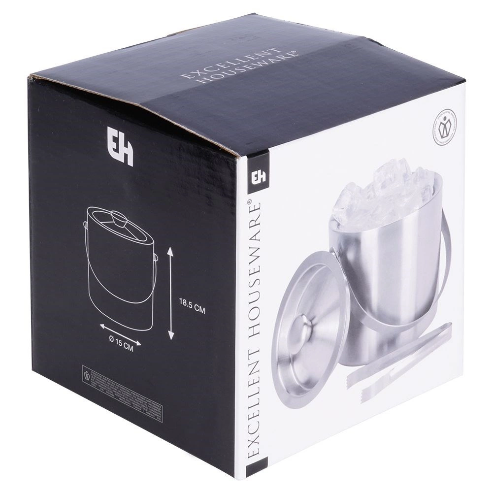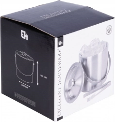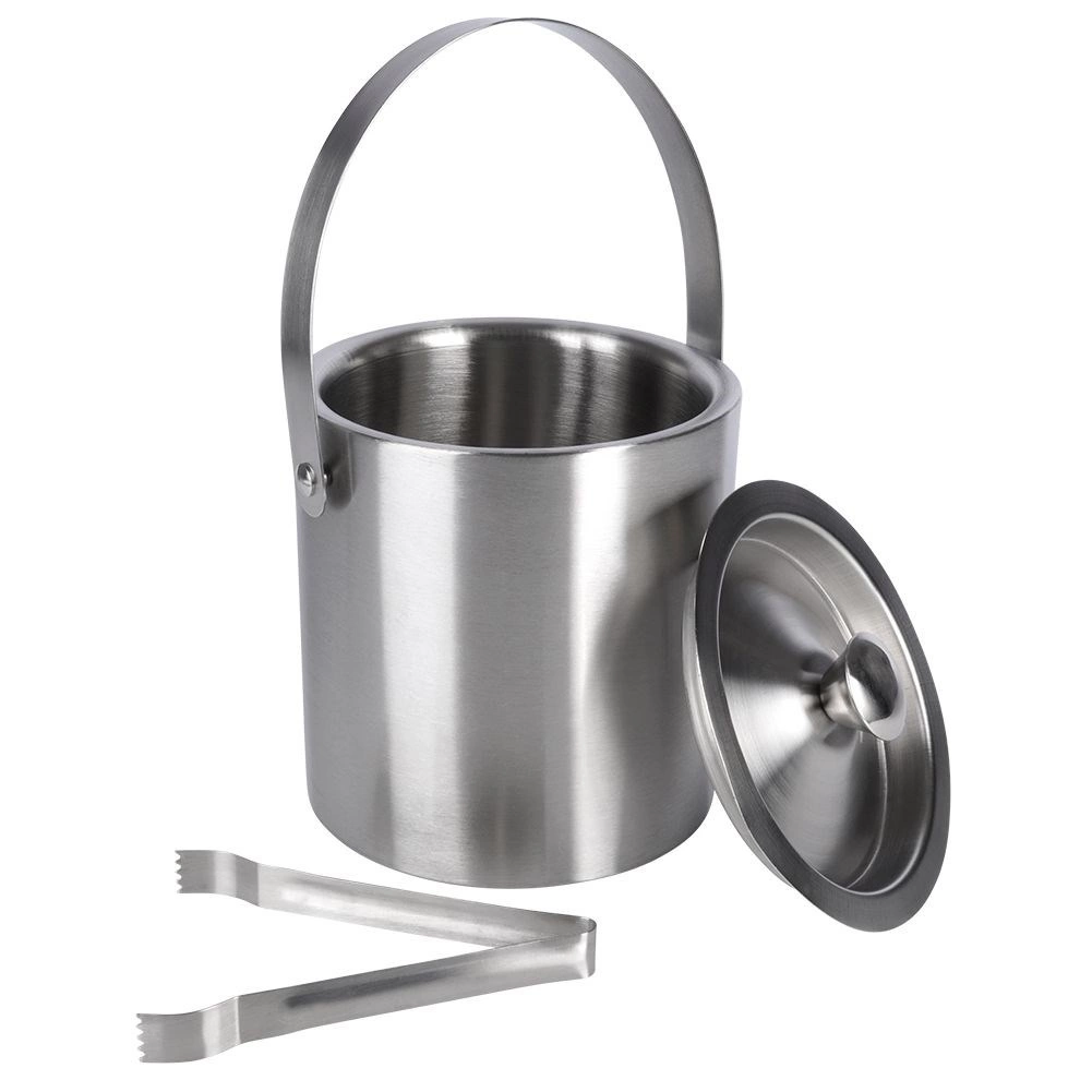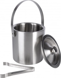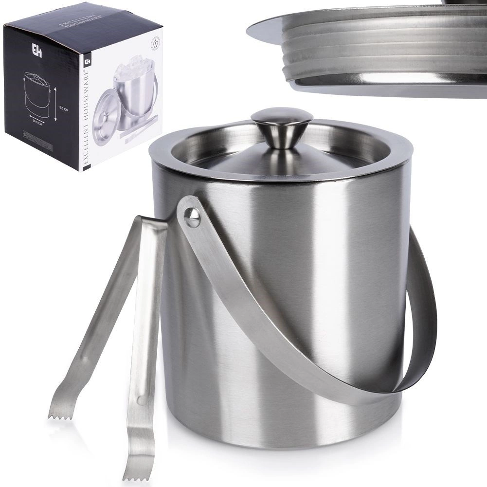 A stylish stainless steel ice bucket with lid, folding handle and tongs keeps ice colder for longer thanks to the double wall. Practical 1.7 L capacity, dimensions 15 × 16 cm and 14 cm tongs for hygienic ice serving. Ideal for bars, parties and catering.