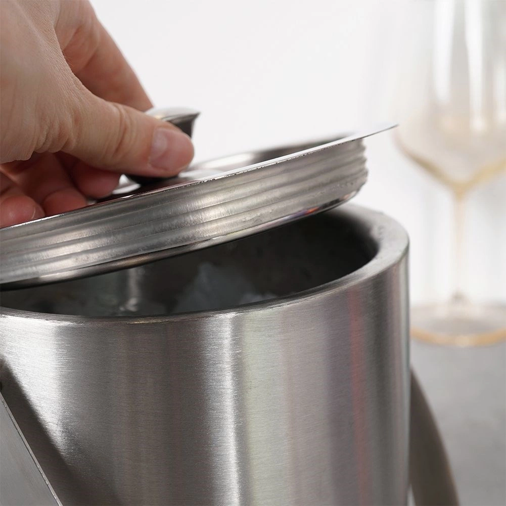 Elegant and durable ice bucket made of matte stainless steel keeps ice cubes perfectly chilled for longer. Thanks to the double-wall insulation, it works like a thermal bucket and slows melting. It includes a tight lid with a grip and a folding handle for comfortable carrying.