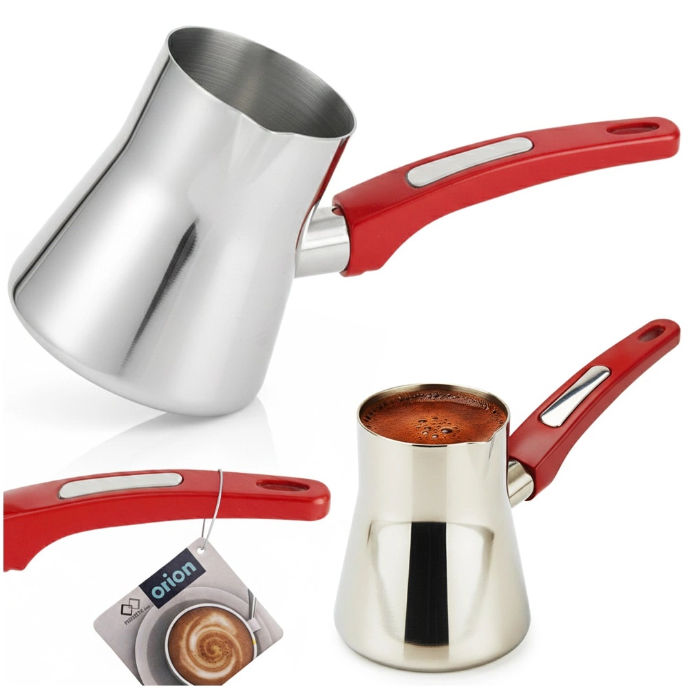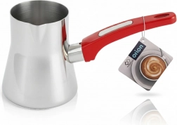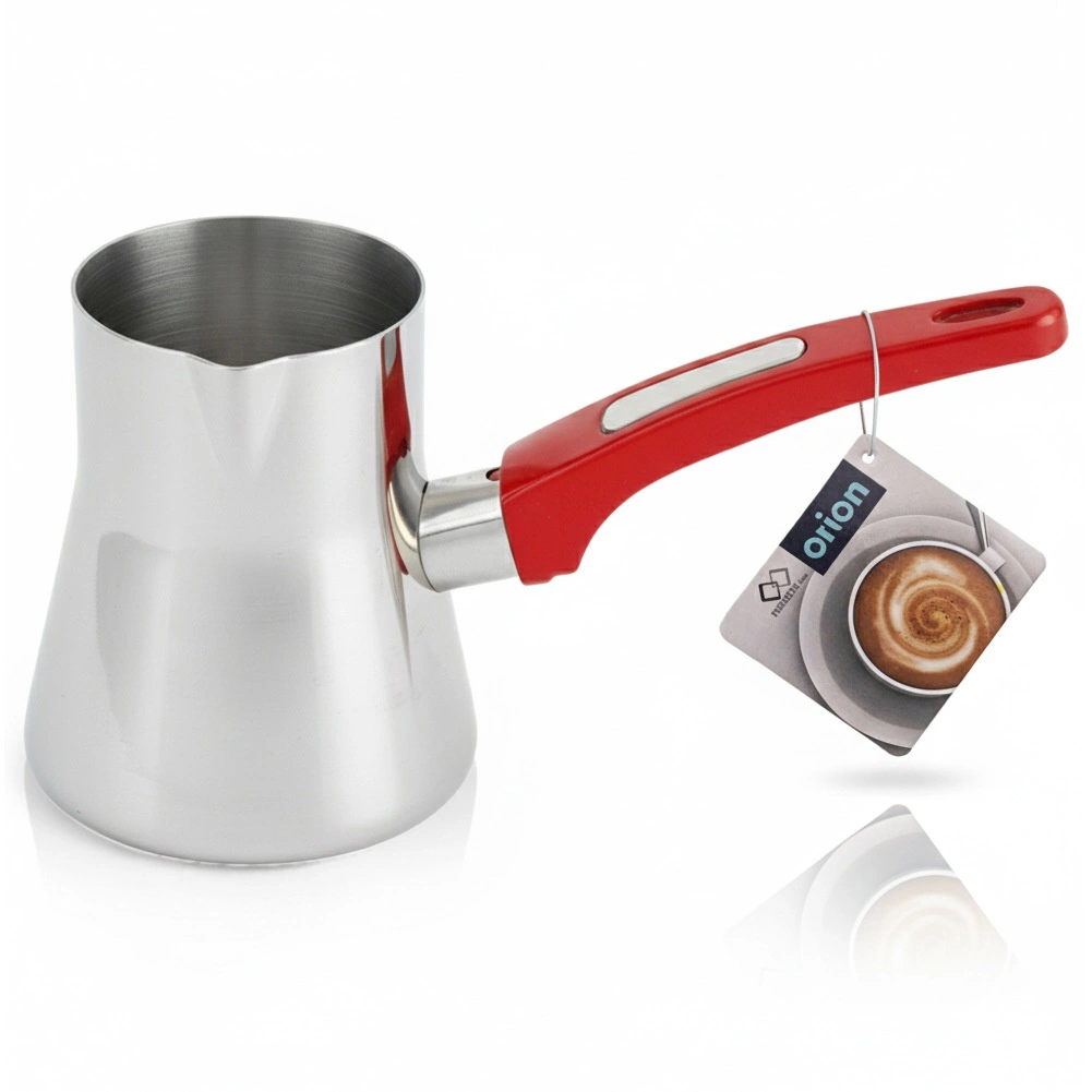 Practical stainless steel pot for Turkish coffee with a capacity of 330 ml, featuring an ergonomic red handle and a pouring spout. Suitable for gas, electric, and ceramic cooktops, also ideal for heating milk. Made of high-quality stainless steel, food-safe, dishwasher safe, with a special anti-drip “collar” to prevent boil-over.