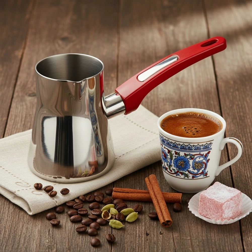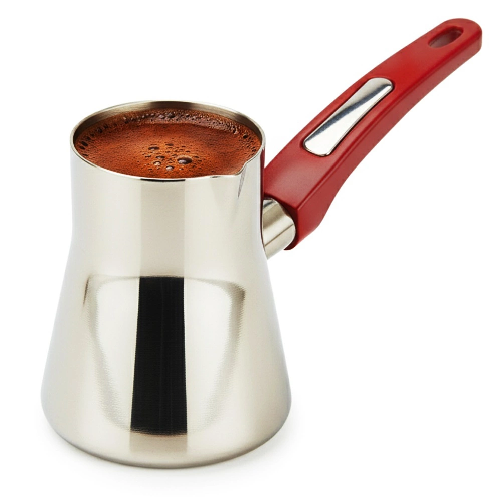 This elegant stainless steel pot (cezve/ibrik) is essential for preparing authentic Turkish coffee. The 330 ml capacity is ideal for one to two servings, the practical spout ensures precise pouring without spills, and the red ergonomic handle offers a safe, comfortable grip.