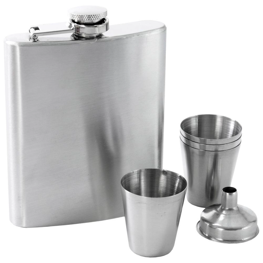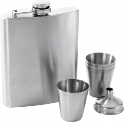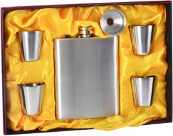 An elegant set for lovers of fine drinks: a 210 ml stainless steel hip flask with a funnel and four shot cups in gift packaging. Made from high-quality stainless steel that doesn't retain odors and doesn't alter the taste of the drink. The flask has a leak-proof screw cap and compact dimensions for easy carrying – ideal for trips and celebrations. A great gift idea.