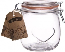Universal 500 ml glass jar with a patent clip closure and rubber seal keeps food fresher for longer. Made from thick glass with a heart relief, ideal for coffee, tea, spices, small fruit, and homemade preserves. Dimensions 11 × 11 × 10 cm. High-quality, airtight closure reliably protects against moisture.
