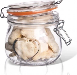 Stylish and practical, this glass jar with clip is a great choice for everyday food storage and preparing homemade treats. Thanks to the patent clip closure with rubber seal, it is perfectly airtight and protects contents from air and moisture. Thick glass with a heart relief gives an elegant look, making it suitable as gift packaging for homemade jams or honey.