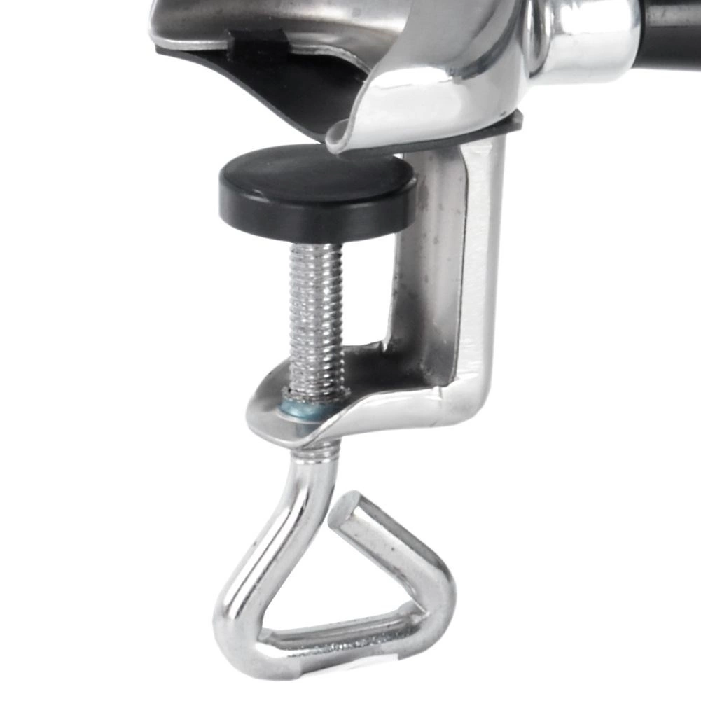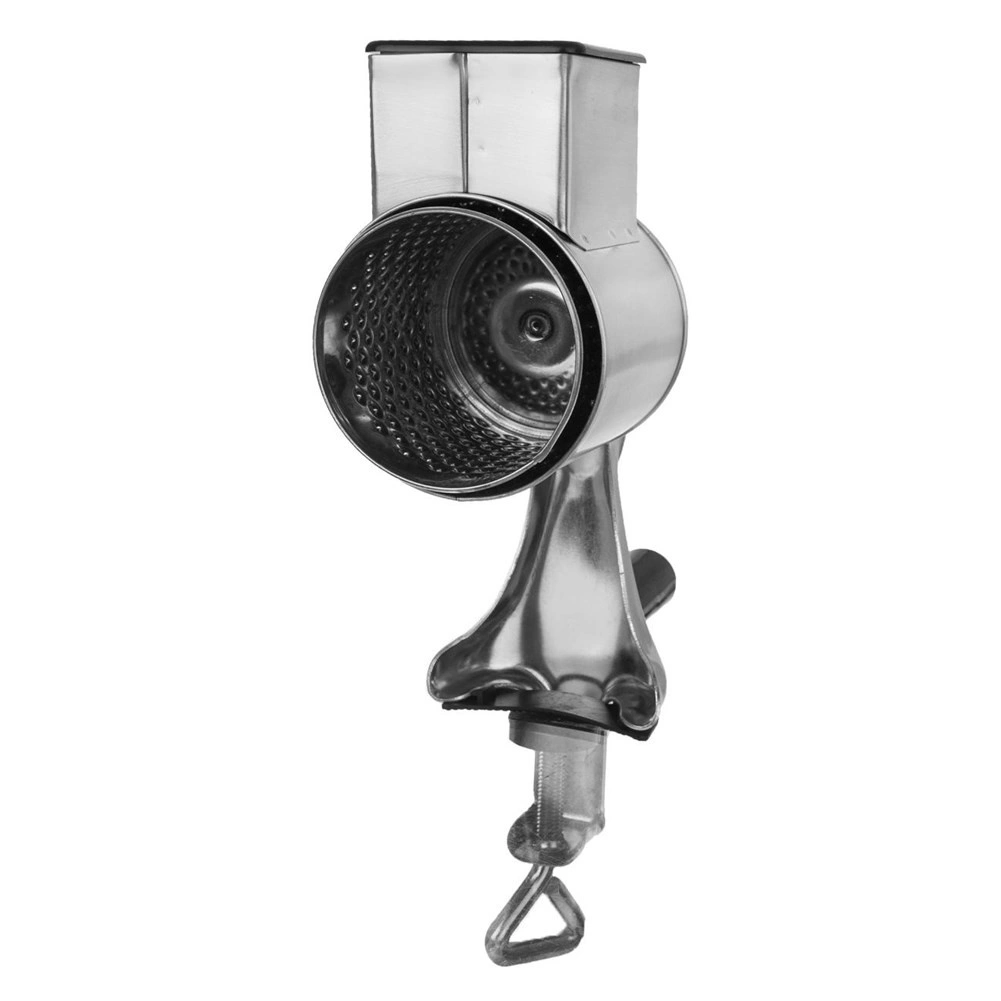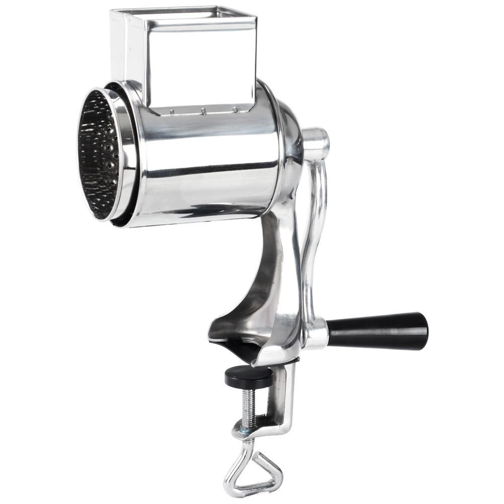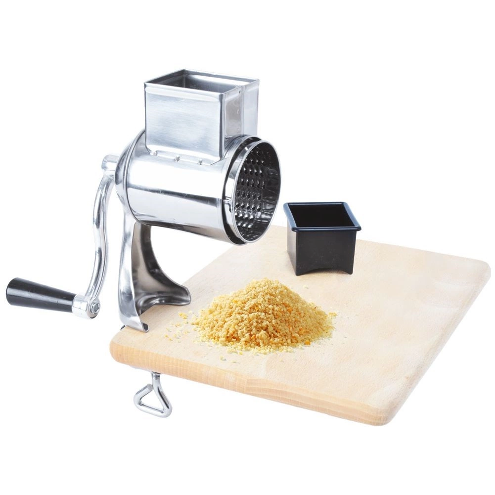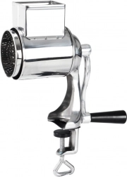 This practical manual rotary grater with a screw clamp for countertop mounting (max. thickness approx. 3.5 cm) provides excellent stability during use. The stainless-steel body paired with durable plastic and a comfortable crank enables smooth grating without excessive force. A hopper measuring approx. 6 × 5 cm easily holds ingredients for continuous feeding.