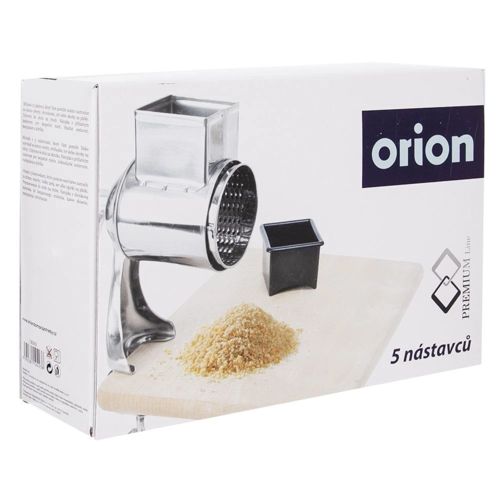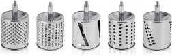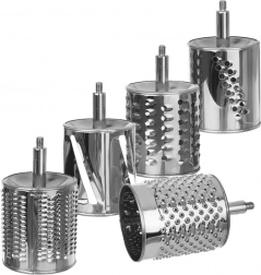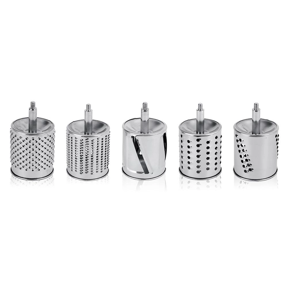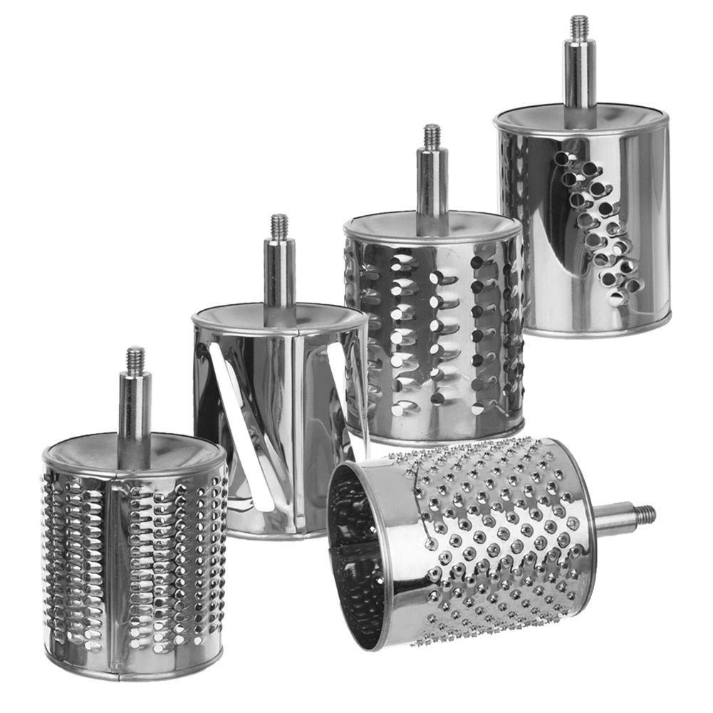 A set of 5 stainless-steel drums covers fine and coarse grating, slicing, and shredding. Ideal for cheese, nuts, chocolate, vegetables, and fruit.