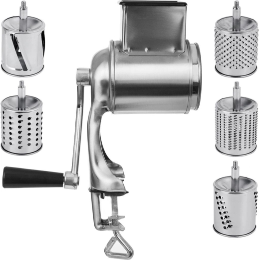 The package includes 5 interchangeable drums for fine and coarse grating, slicing, and shredding. Use them to make fresh breadcrumbs, grate cheese, nuts, or chocolate, and slice fruit and vegetables for salads or desserts. Thanks to the protective pads, the clamp won’t damage the surface and keeps the unit firmly in place.