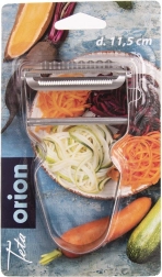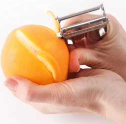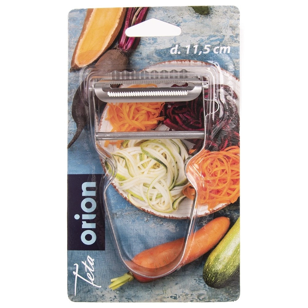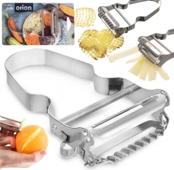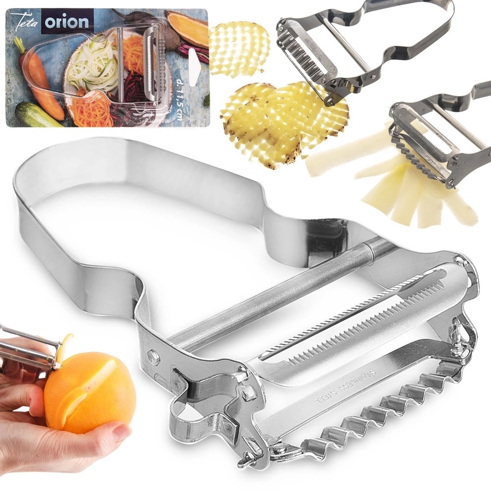 Practical stainless steel peeler with two blades for quick peeling, slicing, and decorative cutting. Offers long lifespan, multiple functions in one tool, and comfortable use for right- and left-handers. Dishwasher safe.