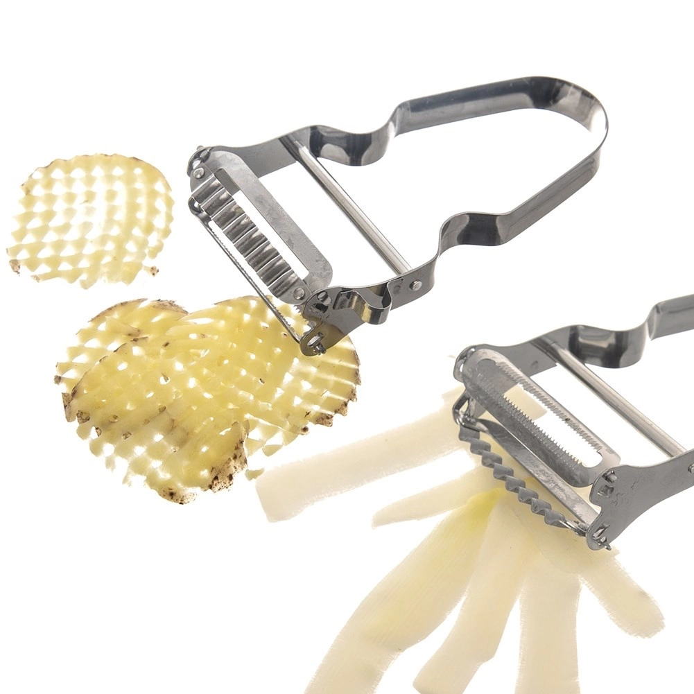 double: smooth for peeling + crinkle/julienne for decorative cuts