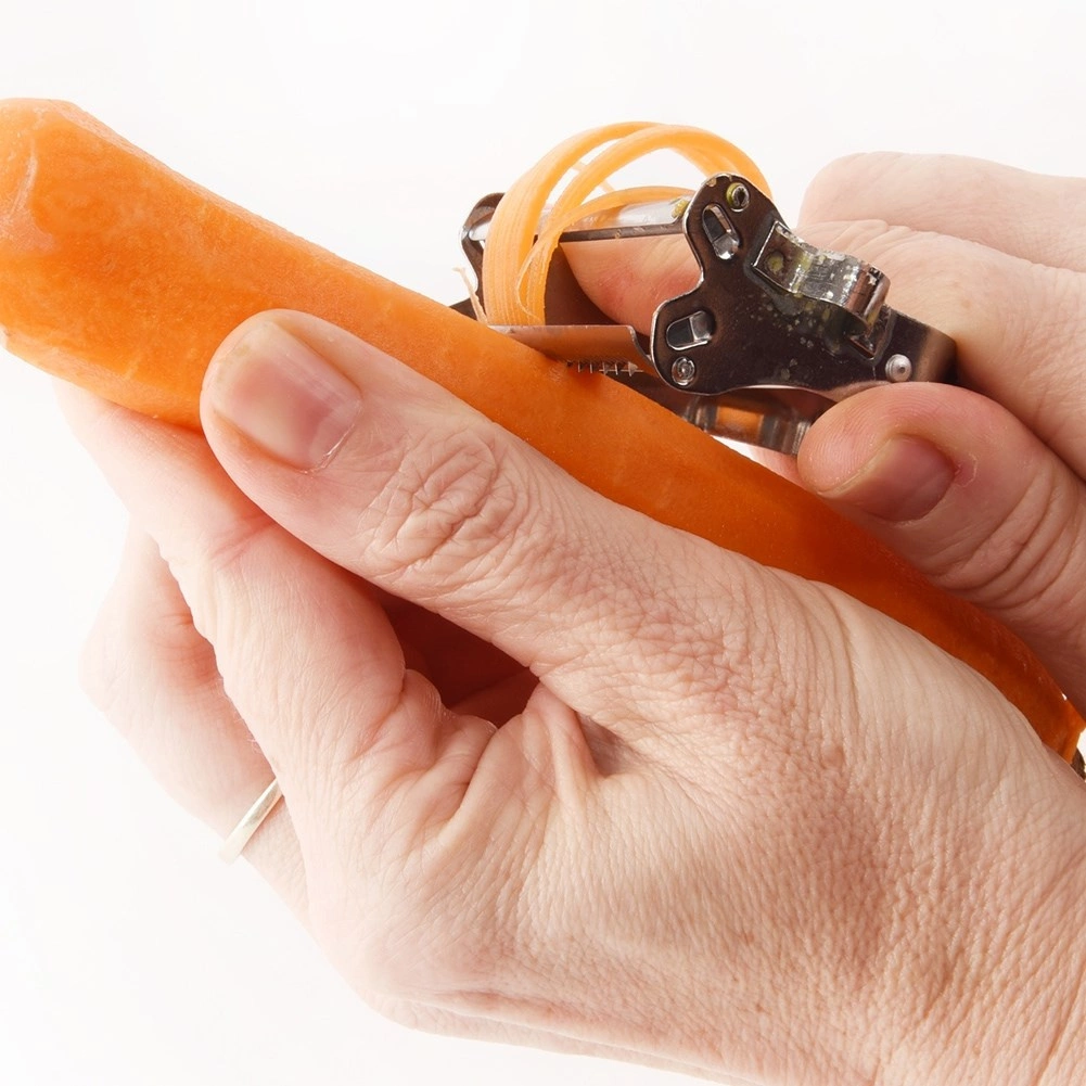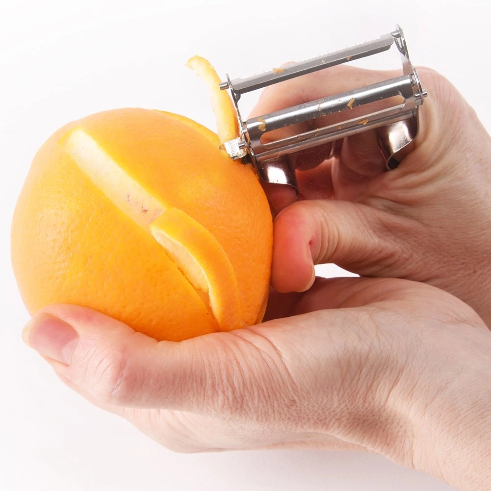 This versatile stainless steel peeler makes prepping vegetables and fruit easier—from potatoes and apples to tomatoes. Two sharp blades handle classic peeling, slicing thin sheets, and making decorative wavy cuts or fine julienne strips for salads and garnishes.
