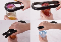 Open a lid easily: choose the appropriate opening, place the opener on the lid, press firmly, and twist smoothly. This practical kitchen tool saves time, effort, and strain on your wrist.
