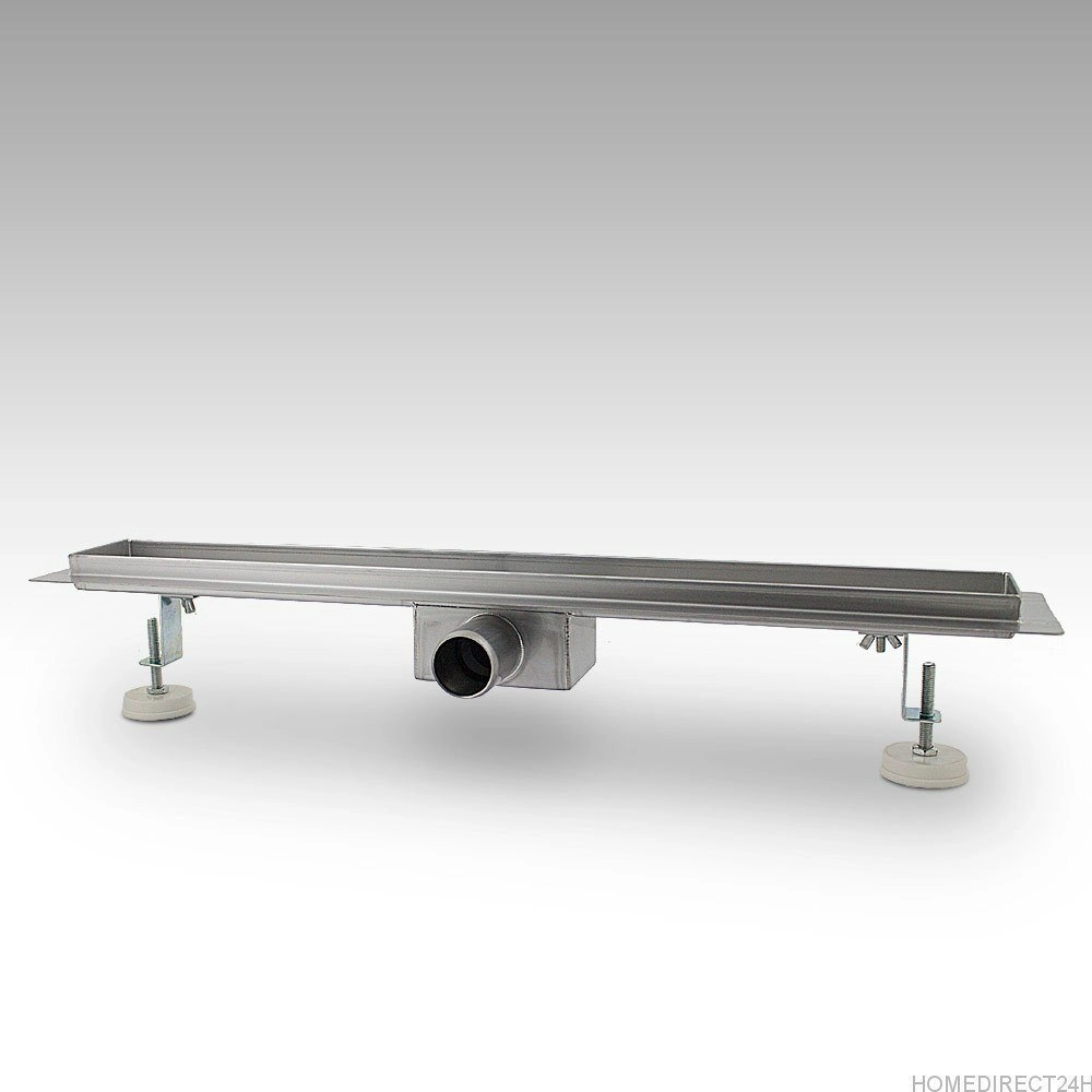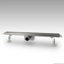 Channel with trap, cover grate, removable insert, protective grid, adjustable feet, sealing collar, hook for grate removal, installation manual