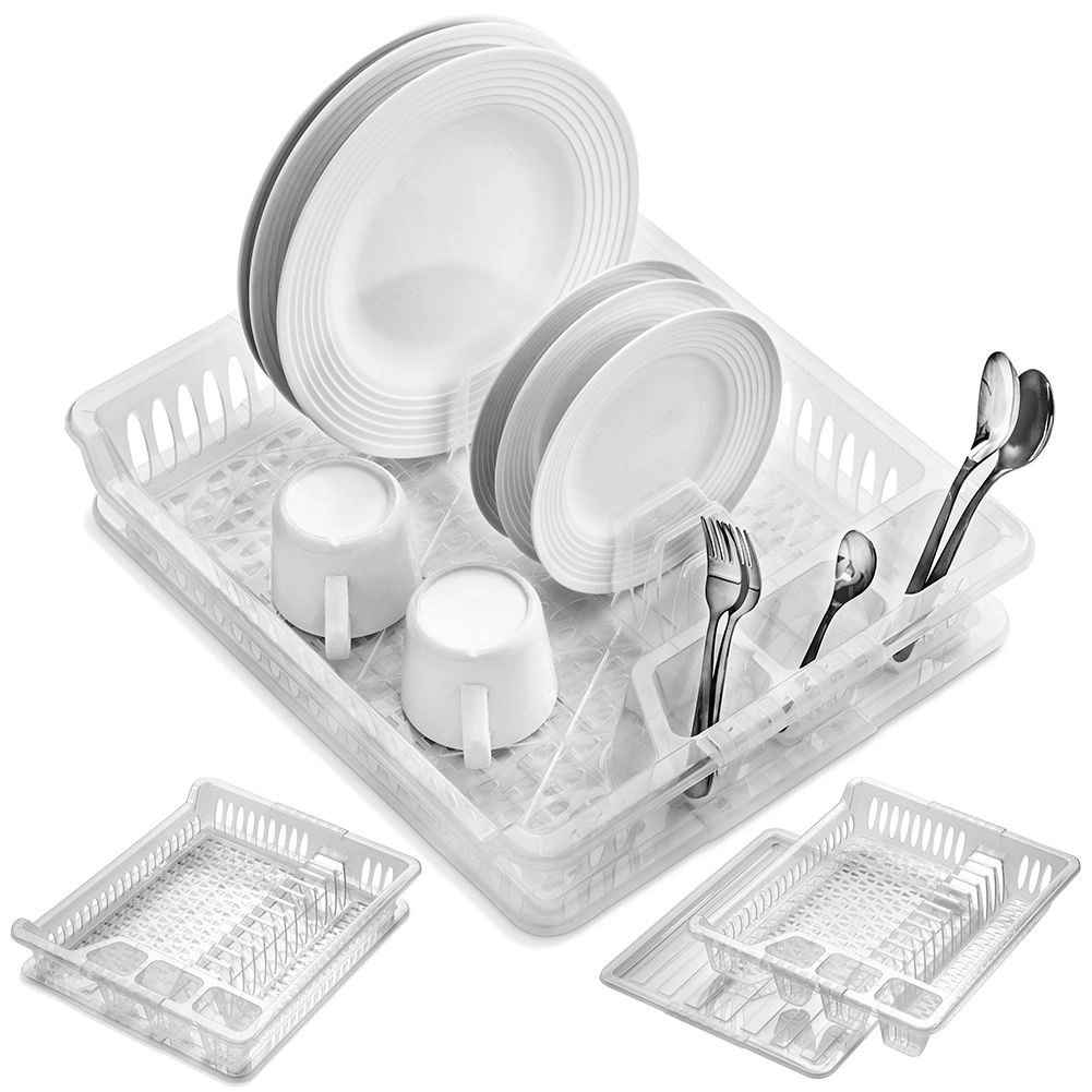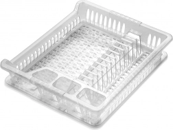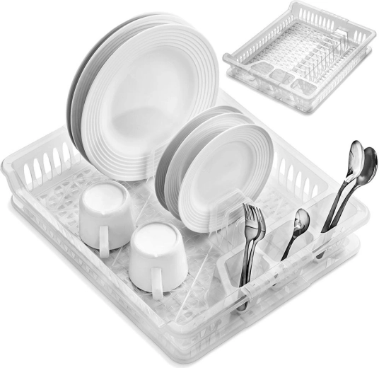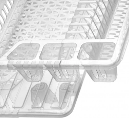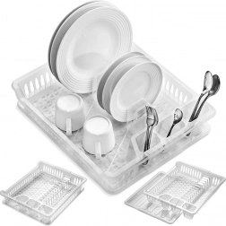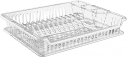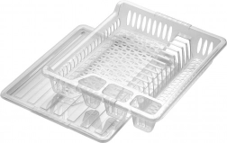 Compact dish rack made of high-quality semi-transparent plastic with a removable drip tray. Offers space for 12 plates, an area for cups and bowls, and 3 cutlery compartments. Keeps your countertop clean and dry, is easy to wash, and suits both modern and classic kitchens.