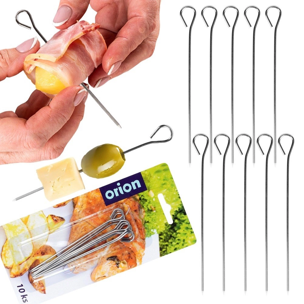 Practical set of 10 stainless steel skewers with a length of 10 cm and a convenient loop for gripping. Ideal for roulades, rolls, braised meat, and also as a stylish cocktail pick for canapés, mini skewers, or fruit bites. Durable stainless steel ensures long life and easy cleaning.