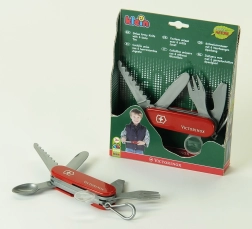This toy was designed with an emphasis on quality and detail to resemble a real Swiss Army knife. It has a red cover with the Victorinox logo and is equipped with a practical carabiner that can be easily attached, for example, to a belt.
