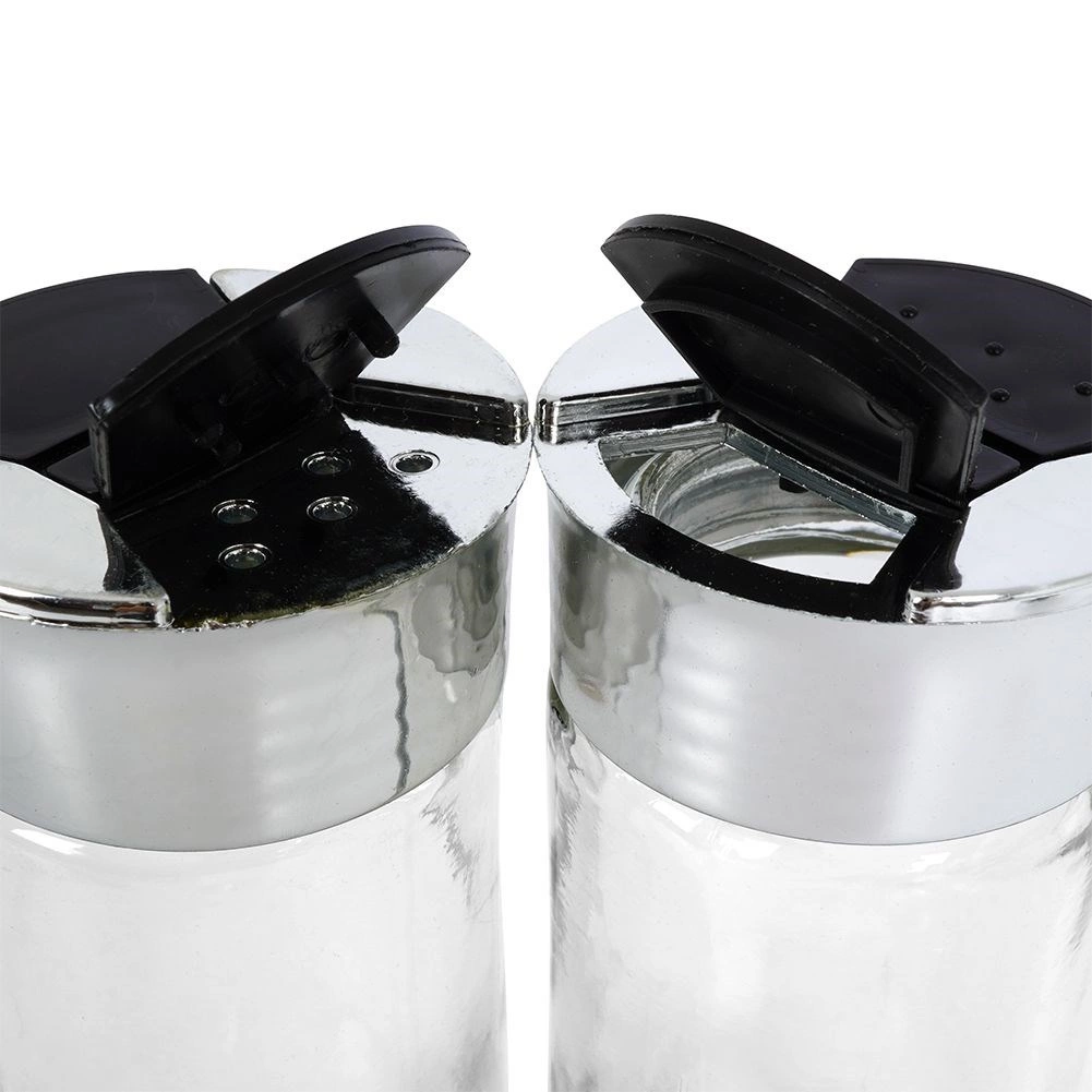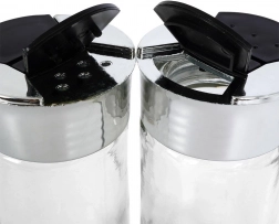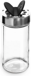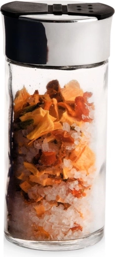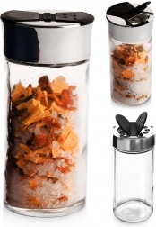 A universal spice jar made of clear glass with a metallic-look ring and a black dual flip lid offers convenient, precise spice dispensing. Two types of openings allow for sprinkling fine spices and pouring coarser ones without the risk of overdosing. Closable flaps protect the contents from moisture and help preserve freshness and aroma.