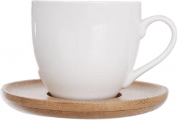 Glossy white porcelain is durable and easy to clean, while bamboo saucers add a warm natural accent and stability when serving.