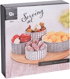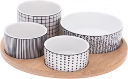 A stylish 5-piece set for everyday and festive dining. Four porcelain bowls in different sizes offer the perfect solution for serving nuts, antipasti, olives, dips, or sauces. The round bamboo tray with designated spots for each bowl ensures safe and comfortable carrying without sliding.