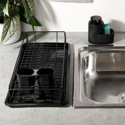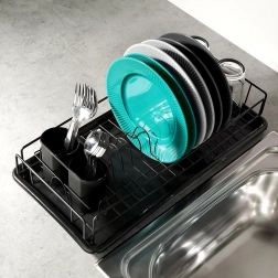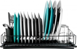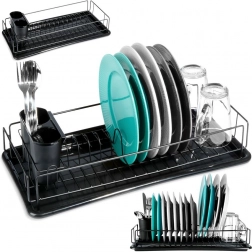 A stylish black dish drying rack measuring 50 × 24 × 9 cm makes drying easier and keeps your countertop dry. It offers a sturdy metal frame, a removable drip tray, and a two-compartment cutlery holder. The minimalist design suits both classic and modern kitchens and provides plenty of space for plates, mugs, and cutlery.