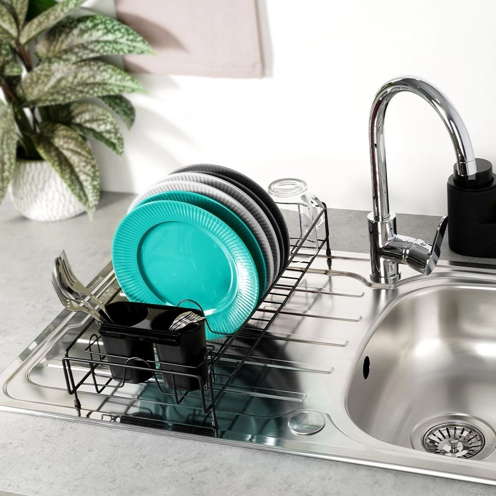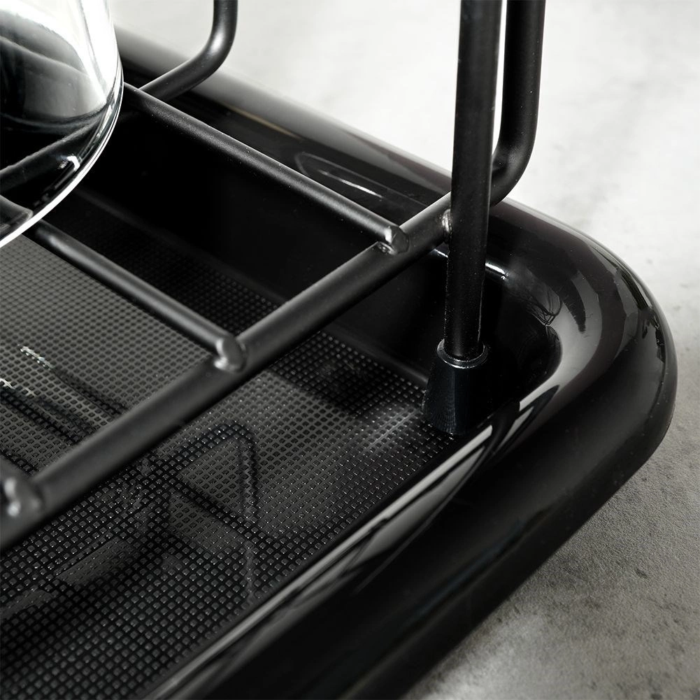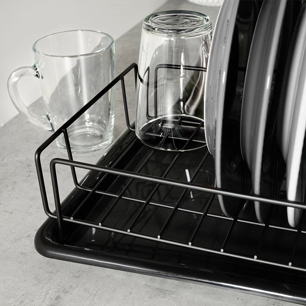 Elegant and compact, this black dish drying rack is a practical addition to any kitchen. Thanks to the sturdy metal frame and removable plastic drip tray, it keeps your countertop clean and dry. The thoughtful layout with plate slots and space for mugs ensures quick, hygienic drying.