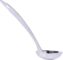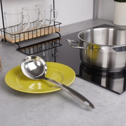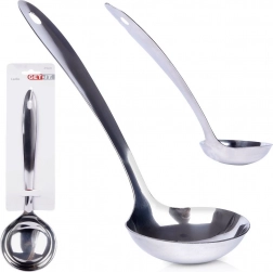 The universal stainless steel ladle is an indispensable helper for everyday cooking and serving. The 80 ml capacity enables precise portioning of soup, sauce, compote, or goulash. The long handle keeps hands at a safe distance from hot liquids, while the hanging eye makes it easy to store on a kitchen rail.