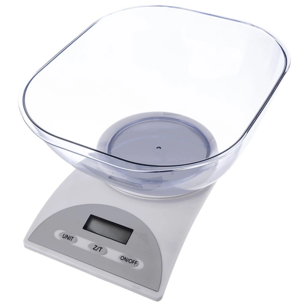 A practical digital kitchen scale with a spacious 3 l bowl and a capacity up to 5 kg offers precise weighing with 1 g increments, a clear LCD display, and a tare function. It features 4 measurement units (kg, g, lb, oz), automatic shut-off, and indicators for low battery and overload. Ideal for accurately measuring ingredients for cooking and baking.