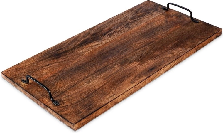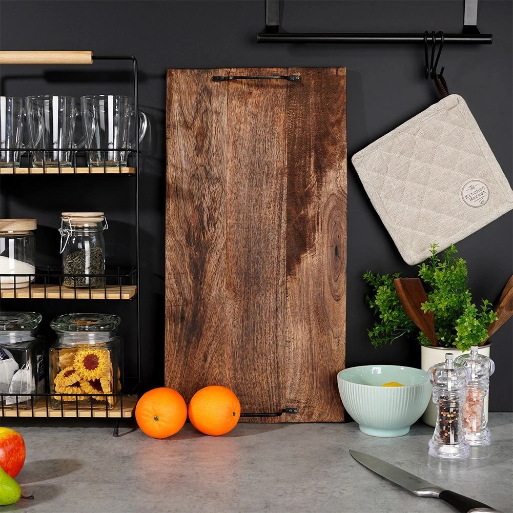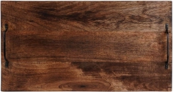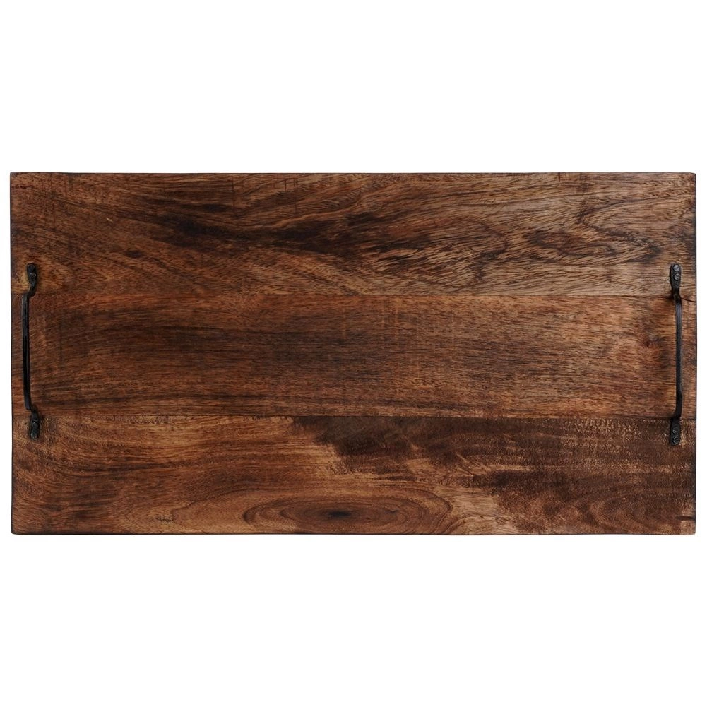 A robust wooden serving and cutting board made of mango wood with two metal handles for easy carrying. It offers a large work surface, moisture resistance, and a stylish distressed look ideal for serving cheeses, cold cuts, or pastries.
