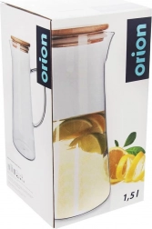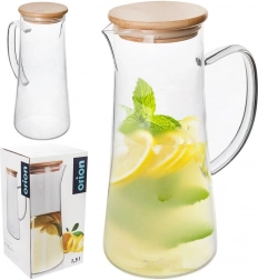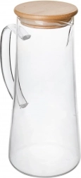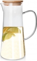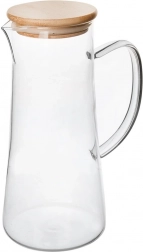 Elegant glass pitcher made of borosilicate glass with a bamboo lid and silicone seal to keep drinks fresh. It features a practical handle, a shaped pouring spout for easy serving, and is suitable for both cold and hot drinks. Thanks to its minimalist design, it looks great on any table.