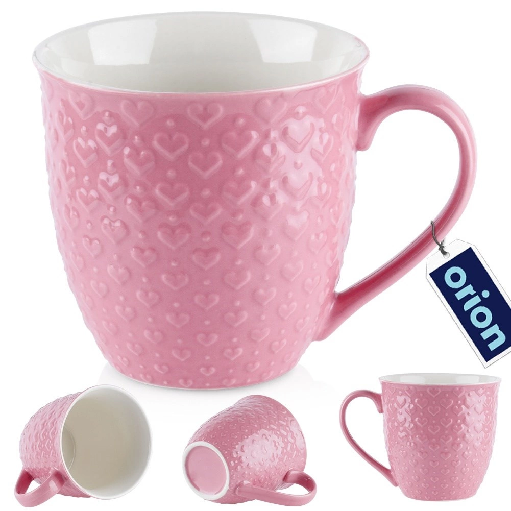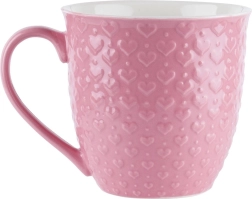 Enjoy your favorite hot drinks in grand style. This pink ceramic mug with a 580 ml capacity features an elegant heart relief and sits comfortably in the hand thanks to its wide handle. Perfect for morning coffee, afternoon tea, and other hot or cold beverages.