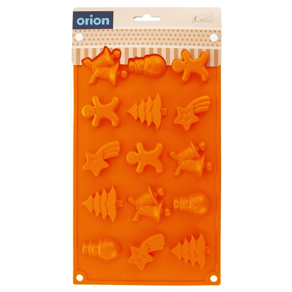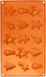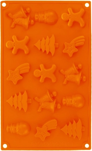A silicone baking mold with Christmas motifs lets you prepare up to 15 pieces of cookies or pralines in five shapes: gingerbread man, tree, snowman, star, and bell. It is heat resistant from -40 °C to +220 °C, suitable for oven, microwave, and freezer, and is dishwasher safe. Thanks to the non-stick silicone, dough releases easily and the mold does not absorb odors or flavors.