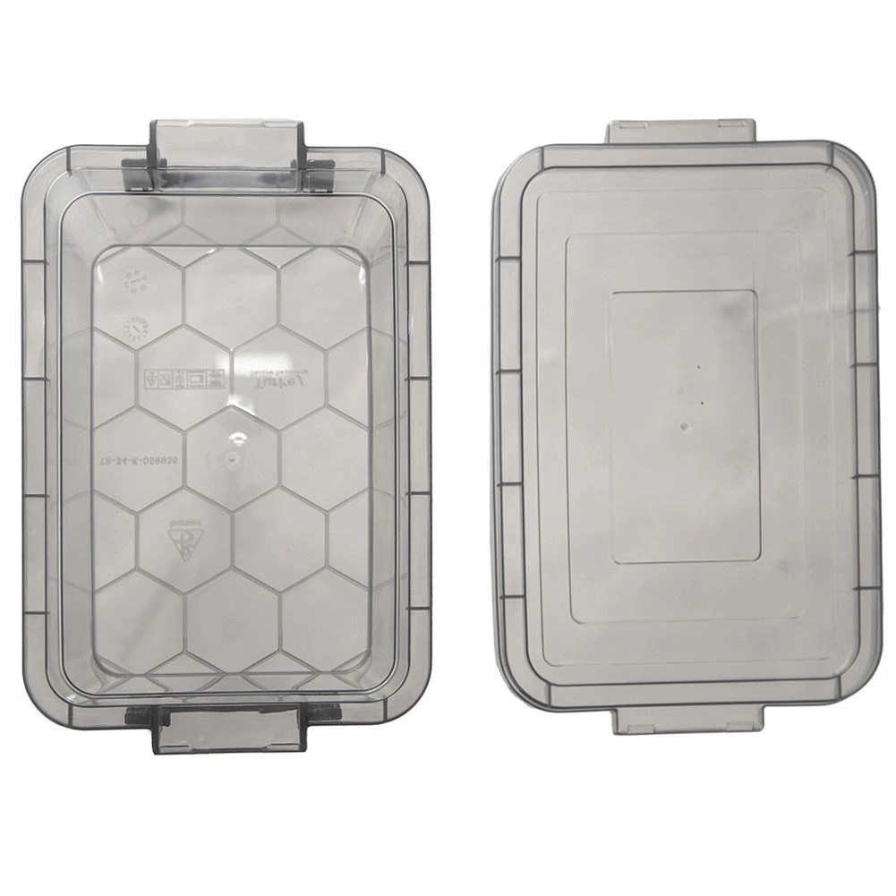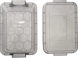 - Transparent, dark grey lid and clips