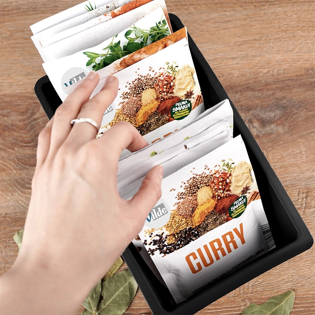 Two internal dividers create three separate compartments. The sachets stand upright, don’t get in each other’s way, and you can always quickly grab the right spice.