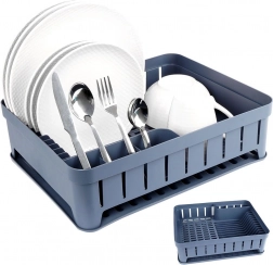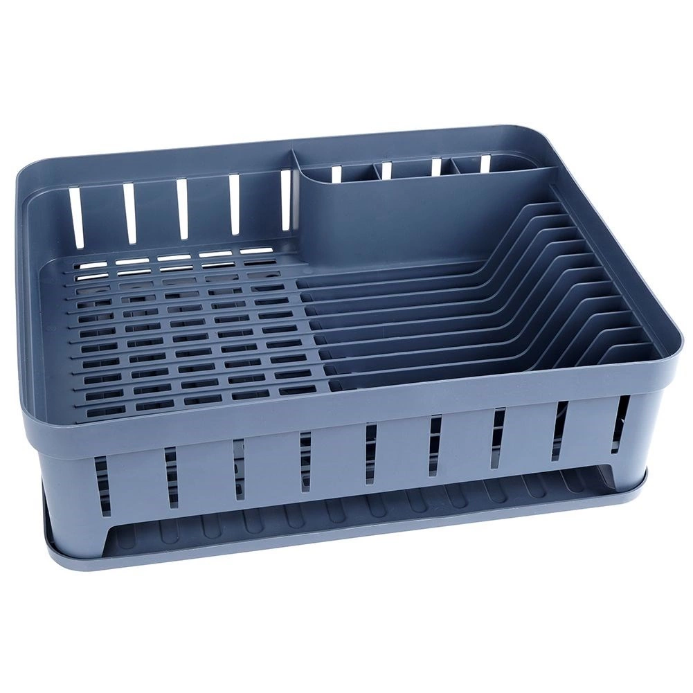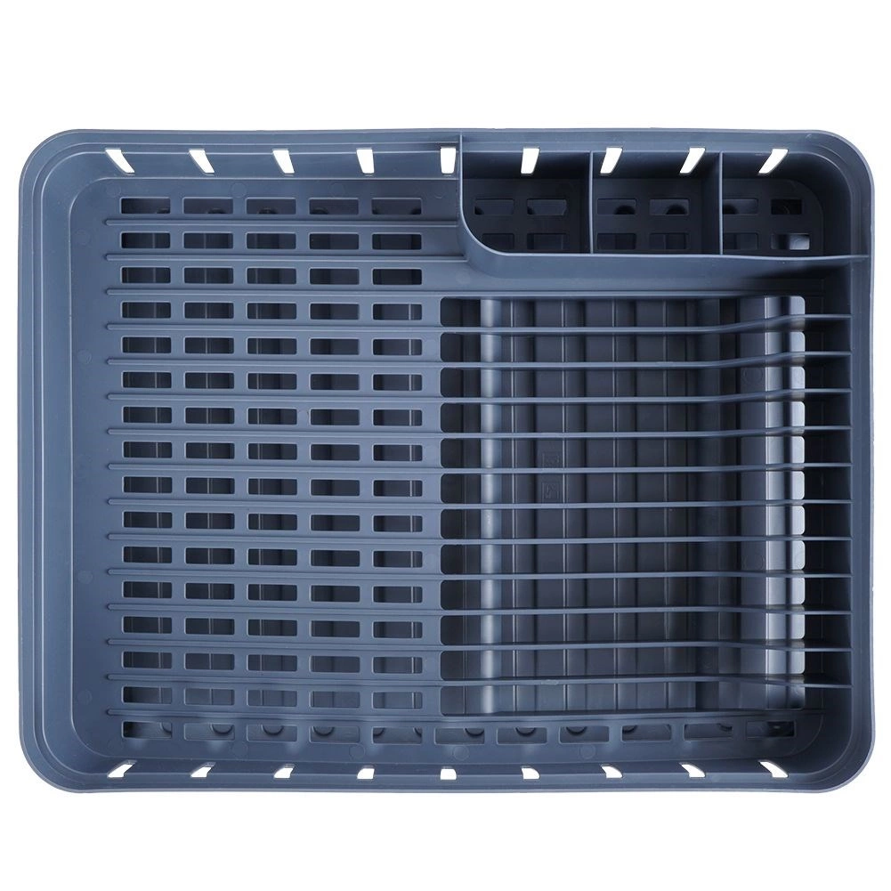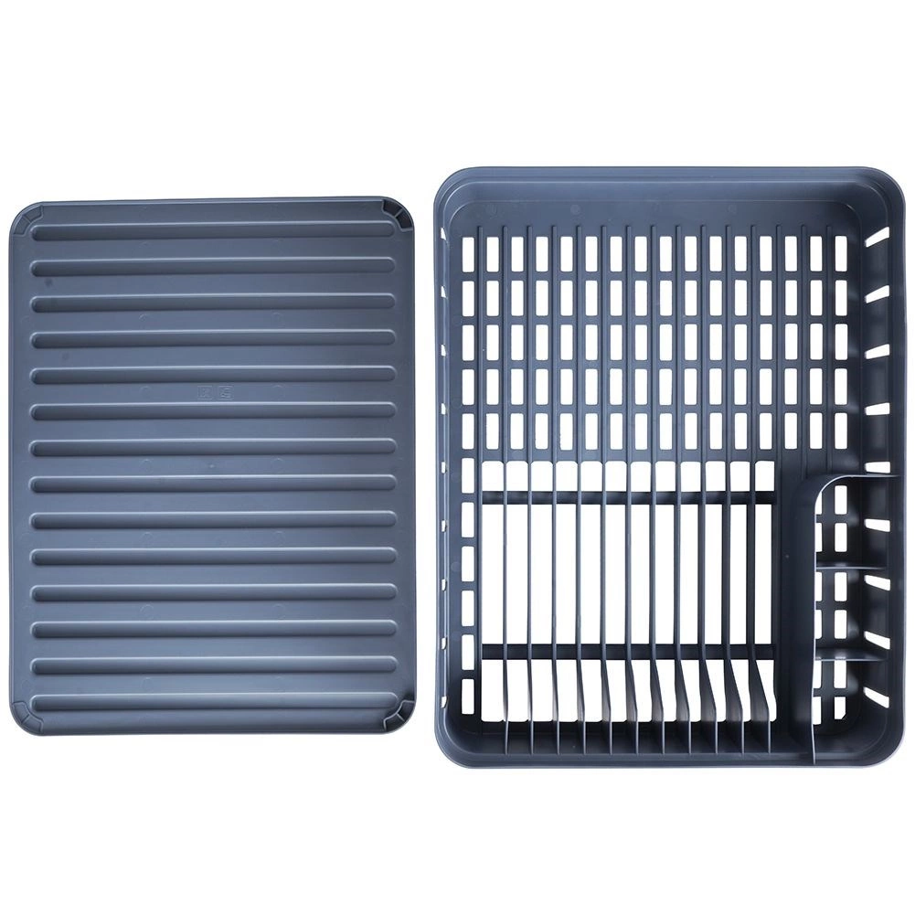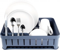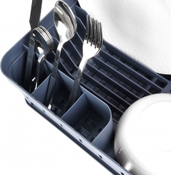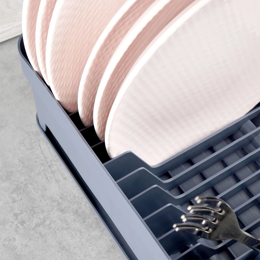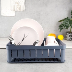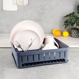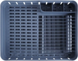 The gray dish rack is designed for convenient and hygienic drying of washed plates, bowls, mugs, and cutlery. Capacity up to 11 plates, a dedicated space for mugs, and a three-section cutlery box keep your kitchen organized and dry. The removable rubber drip tray reliably catches excess water.