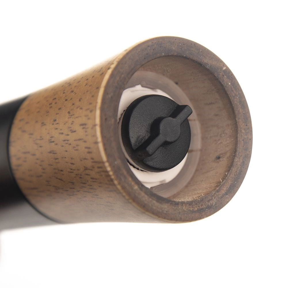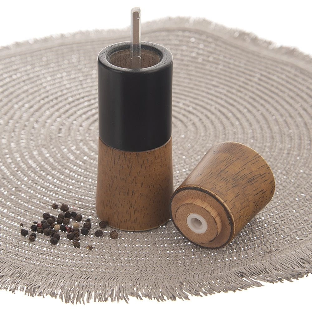 A stylish manual mill for pepper, salt, and other spices, 15.5 cm tall, combining natural wood with black accents. It features a ceramic grinding mechanism, stepless grind-size adjustment, and an ergonomic shape for comfortable use. Freshly ground spices add intense aroma and flavor to dishes, while the mill also serves as an elegant addition to your kitchen.
