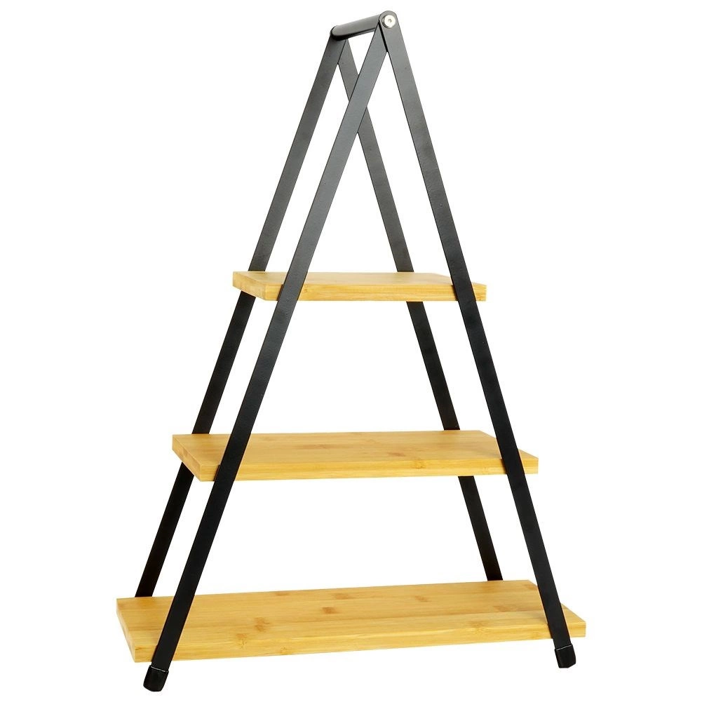 This stylish three-tier stand combines natural bamboo with robust black metal for a stable and decorative presentation of refreshments. It is perfect for cupcakes, pastries, mini desserts, as well as cheese and charcuterie boards or savoury snacks. The triangular A-frame saves table space and elevates any spread.