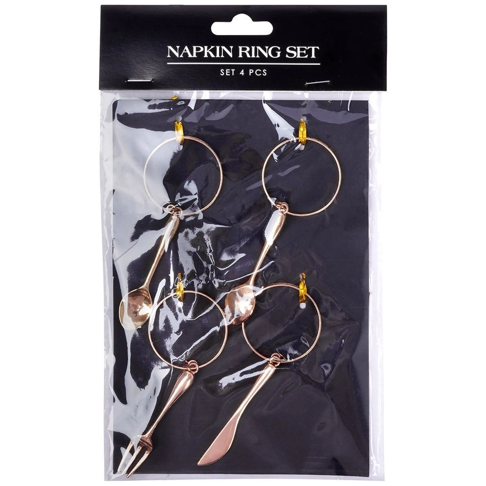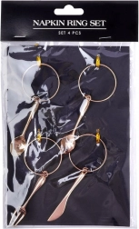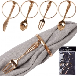 An elegant set of four gold-colored napkin rings adds a luxurious touch to your table setting. Each ring is adorned with mini cutlery – a fork, a knife, and two spoons – creating a stylish table decoration. The rings are metal, durable, and reusable, hold napkins firmly in a roll, and match all colors and types of table settings.