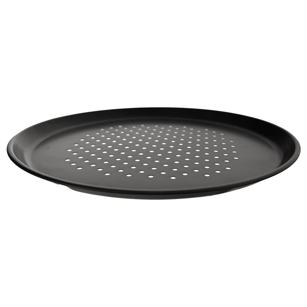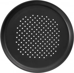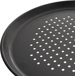 Round pizza and pie pan with a perforated base for a crispy crust and even baking. Made of carbon steel with a non-stick Teflon coating, heat-resistant up to 220 °C. A practical higher rim maintains the pizza’s shape and makes handling easier.