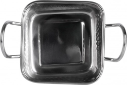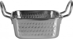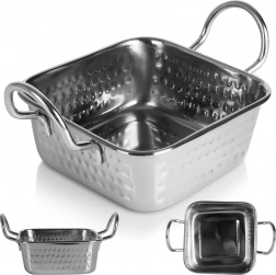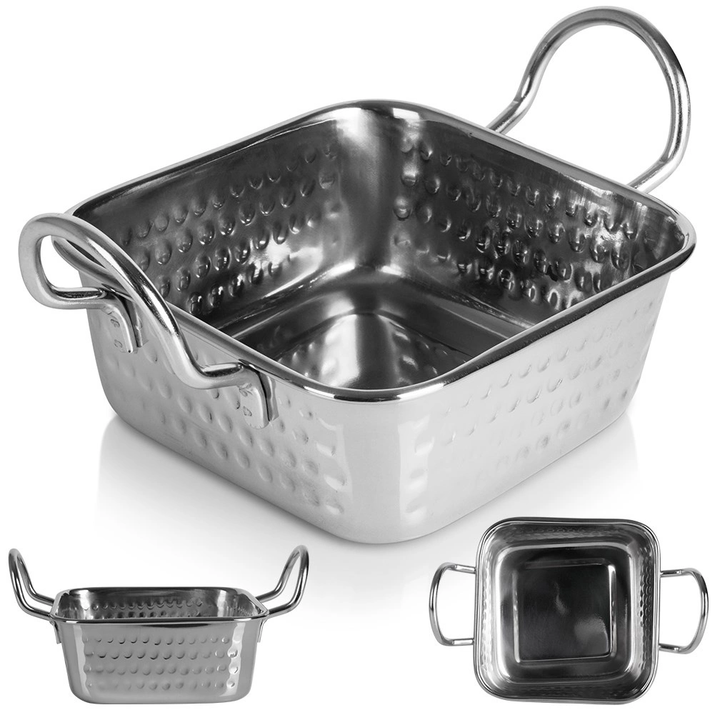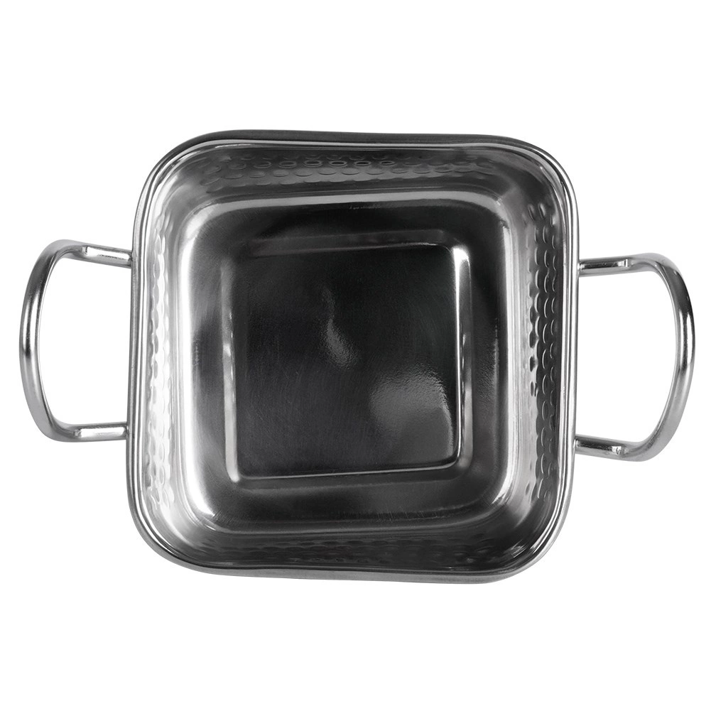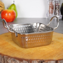 This square stainless steel serving dish with a fashionable hammered finish brings a professional look to your table. Great for serving fries, roast potatoes, vegetables, meat or vegetarian delights, and small sides.