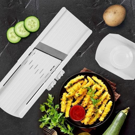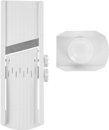 This durable white mandoline combines speed, precision, and safety when slicing fruits and vegetables. The smooth thickness control via the side dial lets you cut from extra-thin slices up to thicker slices of 8 mm — ideal for salad cucumbers, grill slices, crispy chips, and homemade fries.
