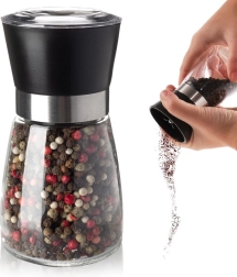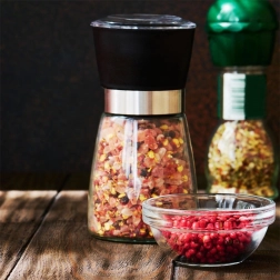 A practical manual grinder for pepper, salt, and other spices with a glass body, 13 cm tall and 6.5 cm in diameter. It features a ceramic grinding mechanism for smooth grinding, adjustable coarseness via a rotating control, and a cap to catch residual grounds. The transparent glass shows the fill level, and the elegant design fits perfectly into any kitchen or dining room.