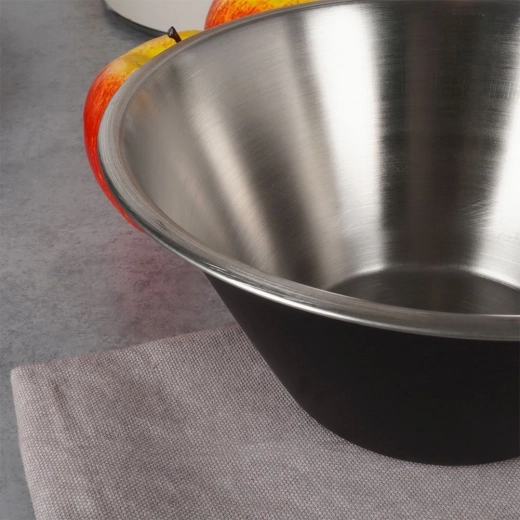 This versatile kitchen bowl made of high-quality stainless steel with a matte black exterior will become your reliable helper for everyday cooking and festive serving alike. The wide rim makes handling and precise pouring easier, while the deep shape is perfect for working with doughs, salads, and creams.