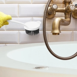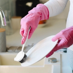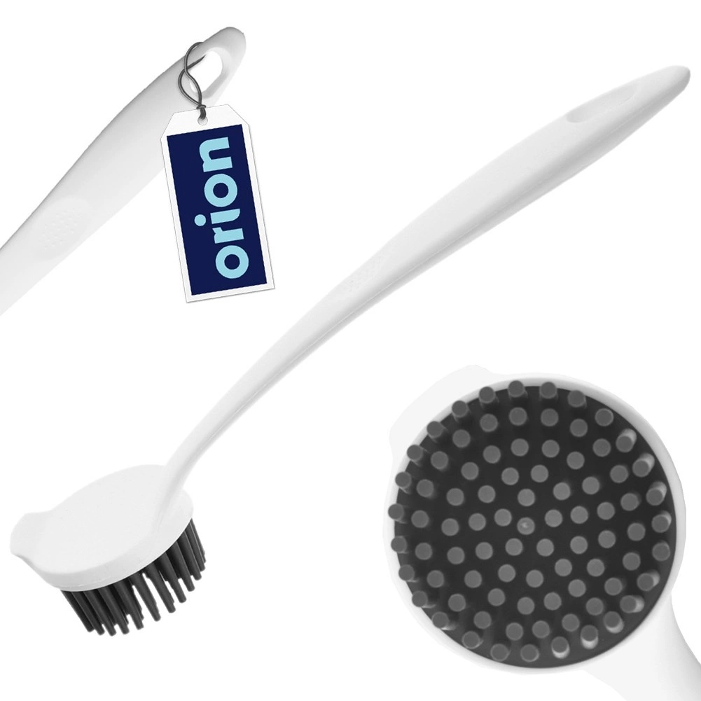 Looking for a hygienic and durable dish brush that can handle ingrained grime? This silicone brush with a long handle effectively cleans plates, pots, pans, and kitchen utensils, and works just as well in the bathroom on grout or the tub. The dense, flexible silicone bristles are easy to maintain, do not absorb odors, and dry quickly.