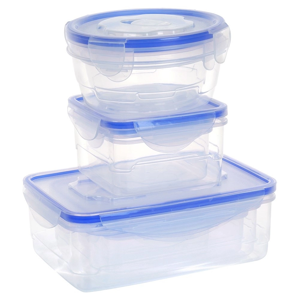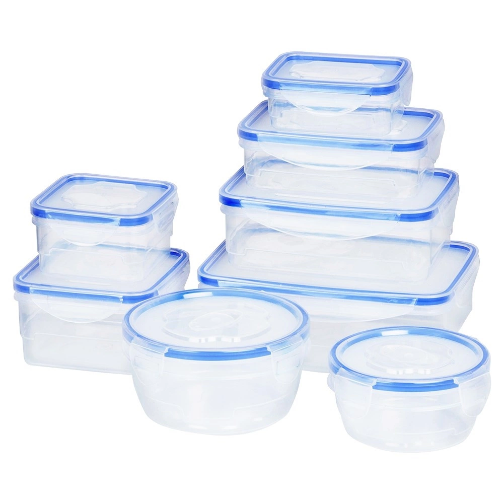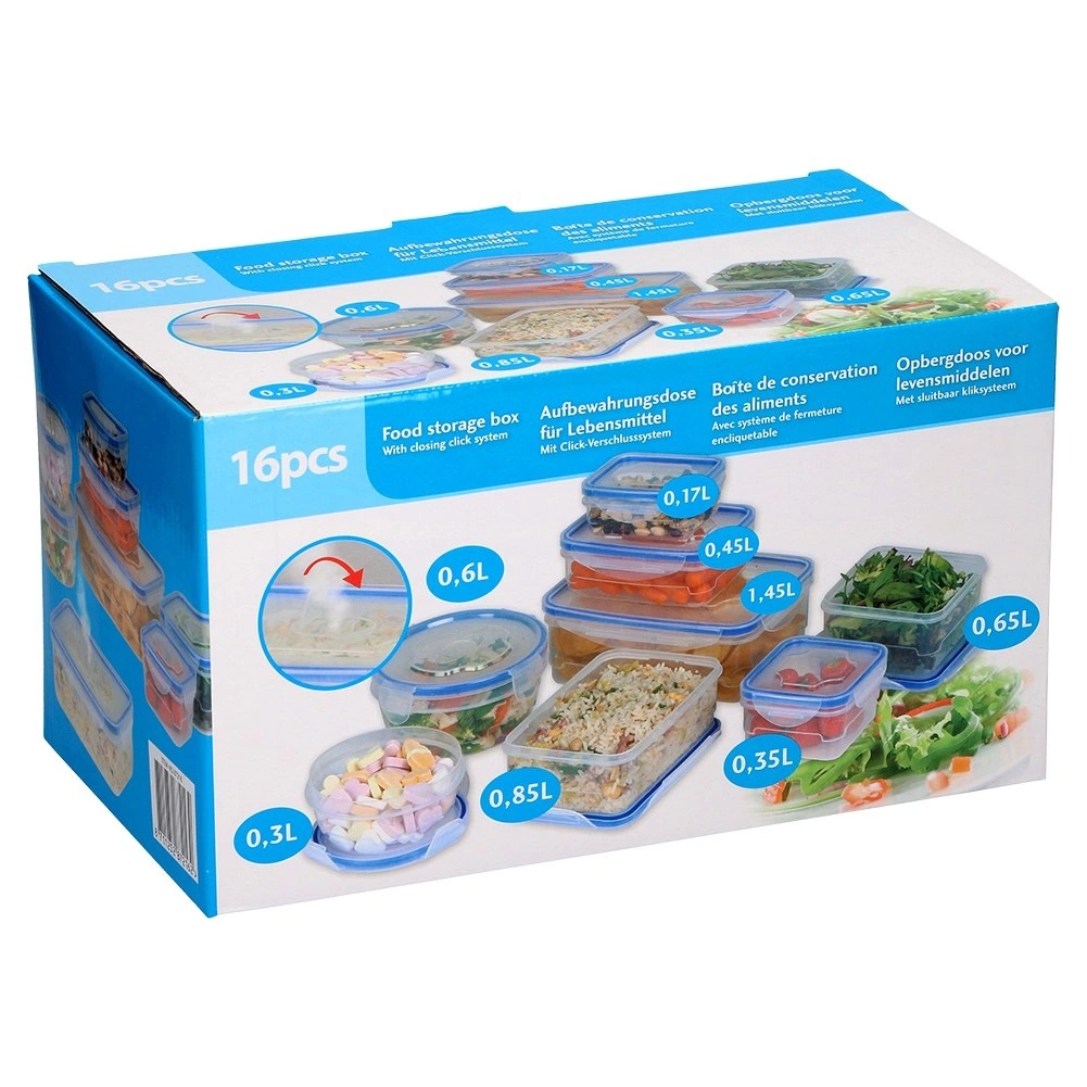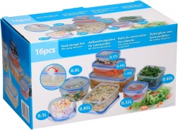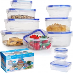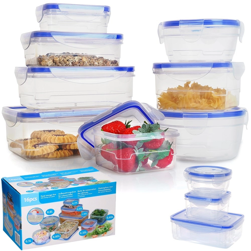 Practical set of 8 airtight food containers with blue silicone seals and four locking clips. BPA-free, durable, airtight and leakproof, suitable for the dishwasher, microwave, and freezer. Various shapes and sizes for neat storage of pasta, cookies, salads, fruit, and leftovers.