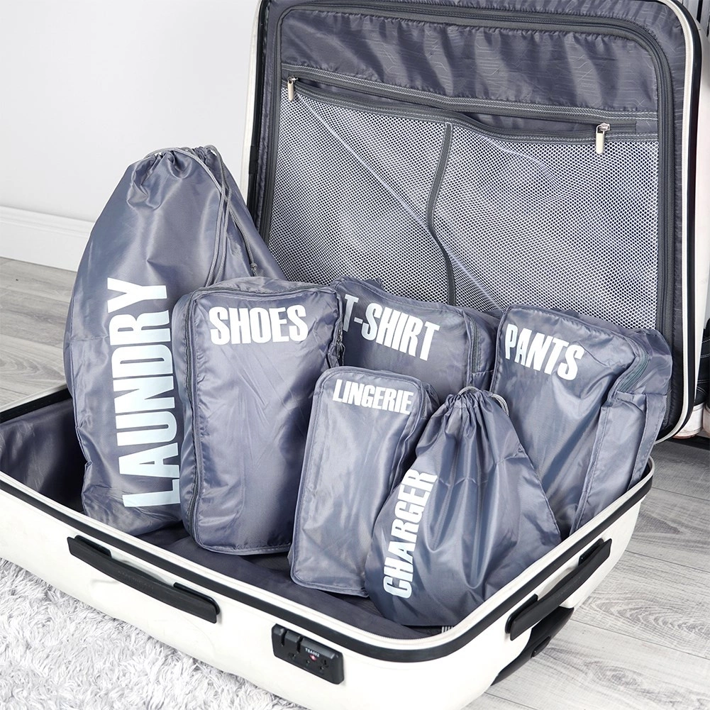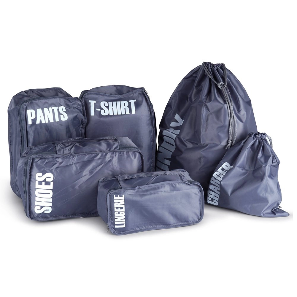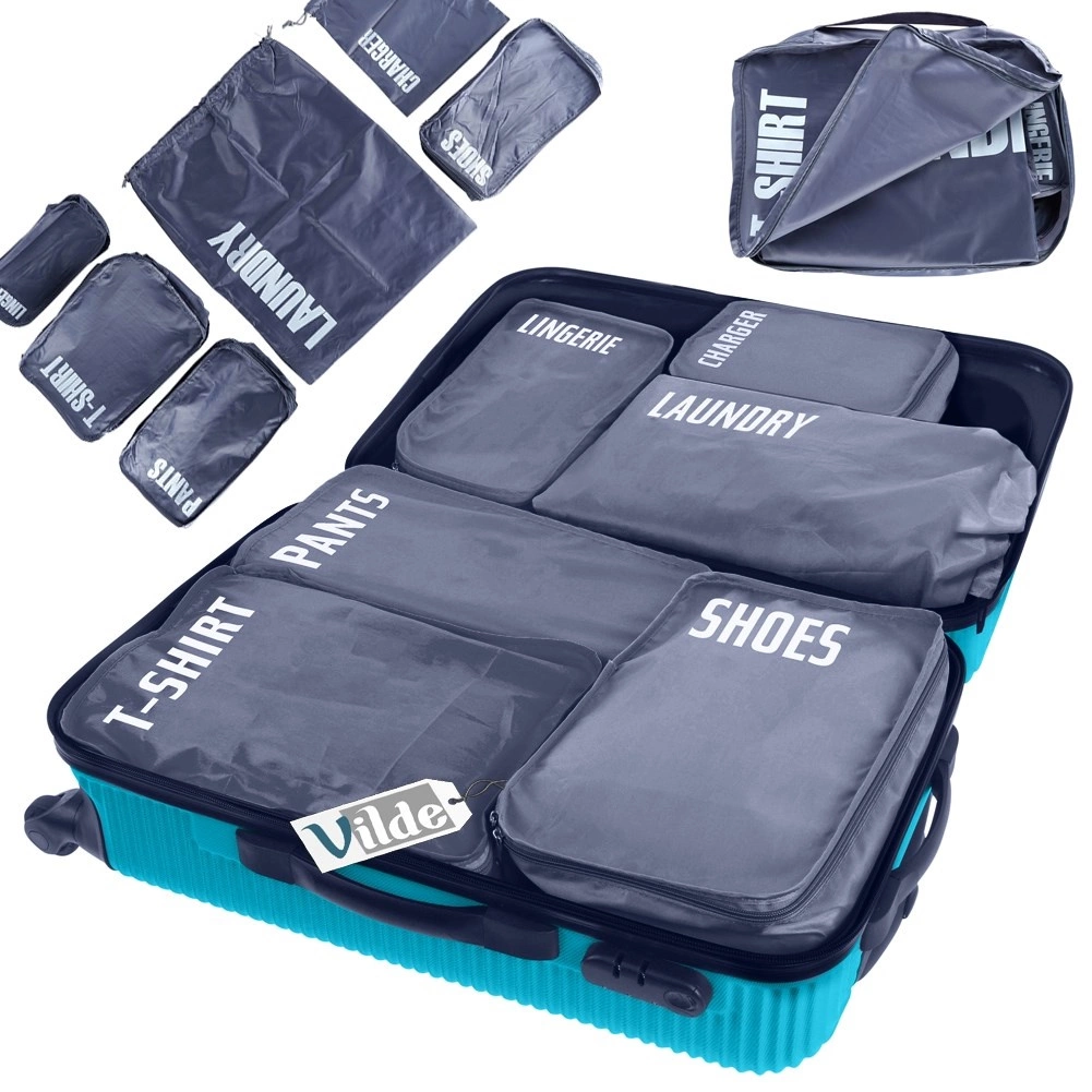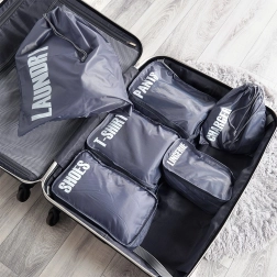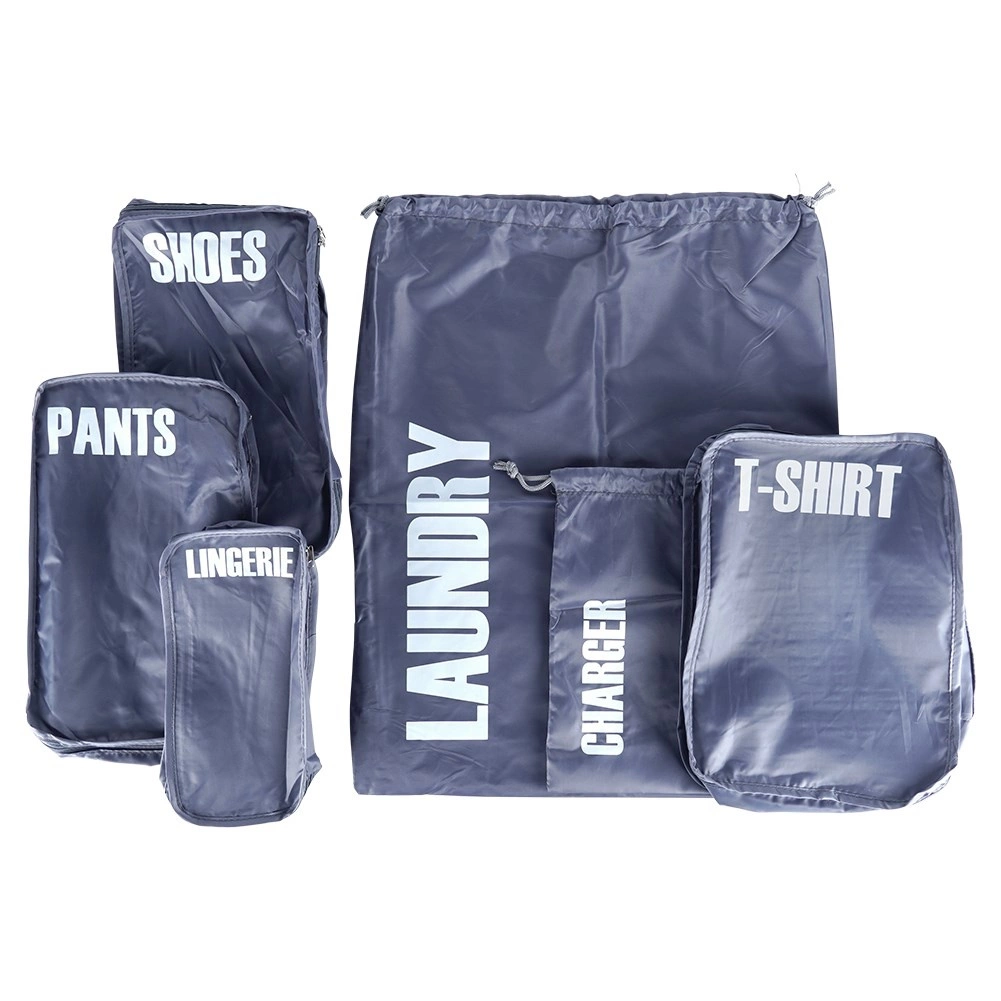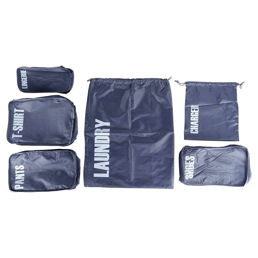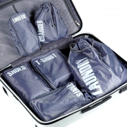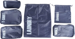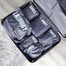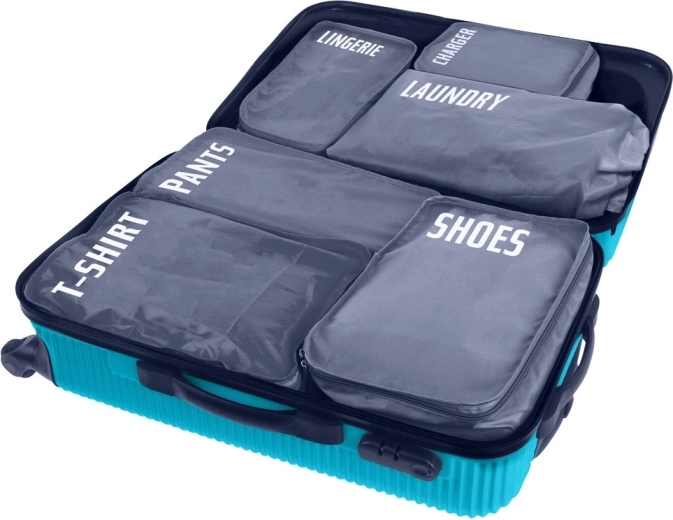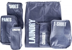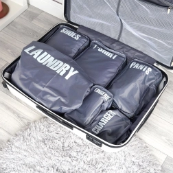 A practical set of 6 luggage packing organizers for perfect order on the go. Each pouch is clearly labeled (laundry, chargers, pants, shoes, underwear, T‑shirts) for quick orientation. Lightweight and durable polyester design, most pouches zip closed and allow efficient use of space in your suitcase.