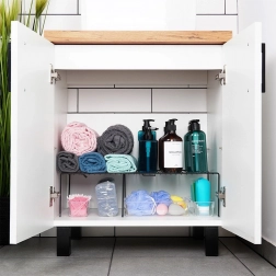 Continuously adjust the width from 34.5 to 48 cm, so you can easily match the shelf to most cabinets and shelves. An ideal solution to optimize space without drilling.
